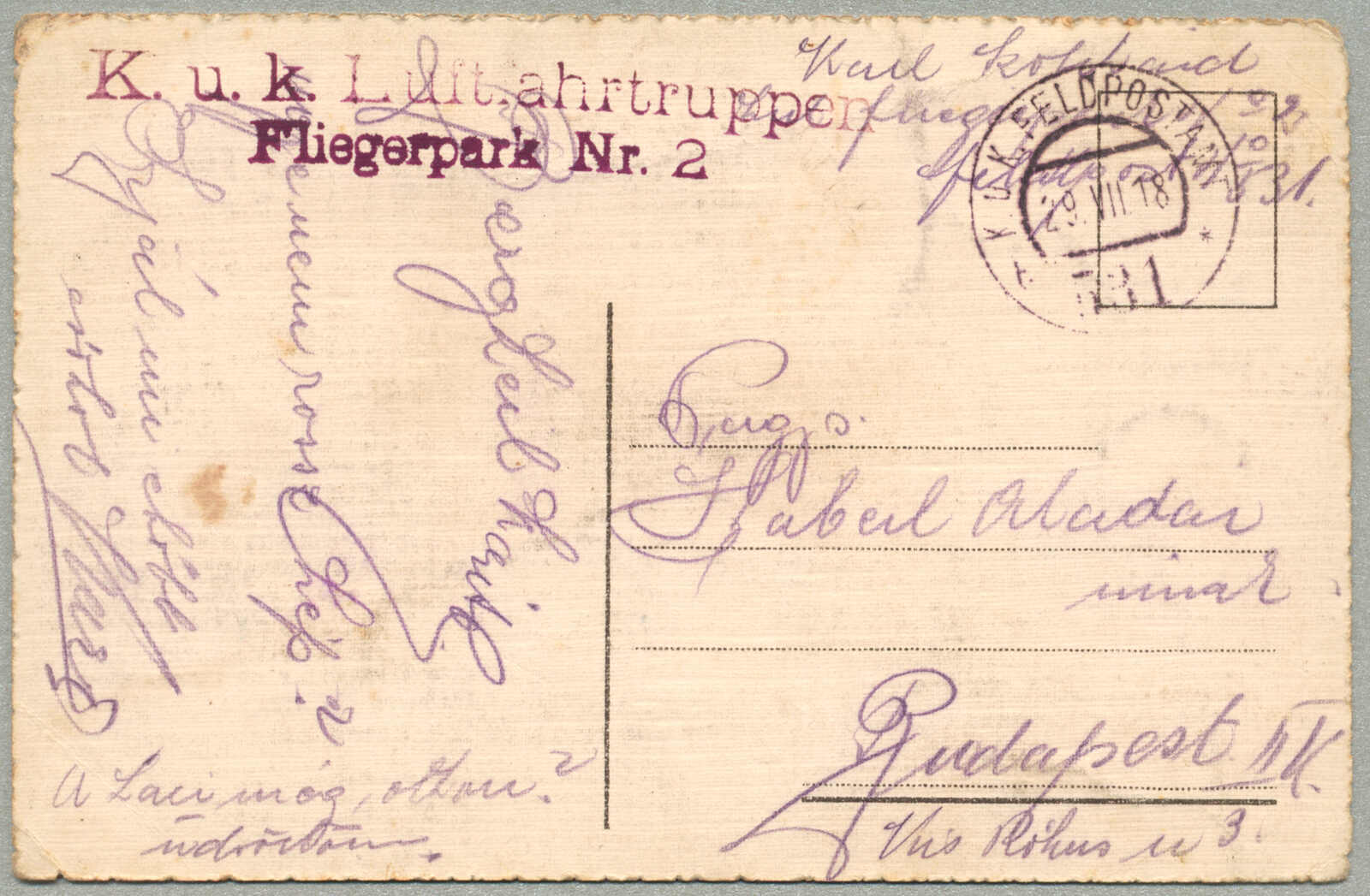 1918, Field post card, from Austria-Hungary to Budapest, sent by K.U.K. LUFTFAHRTRUPPEN FLIEGERPARK NR. 2, endorsed by K.U.K. FELDPOSTAMT 531B / 29.VII.18 handstamp, Italian scenic postcard with printed poetry on reverse, handwritten