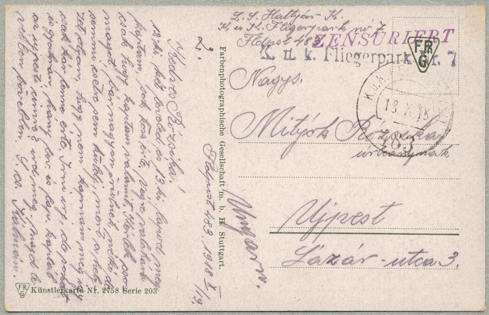 1918, Field post card, from Austria-Hungary to Nyiregyhaza, sent by K.U.K. FLIEGERPARK NR. 7, endorsed by K.U.K. ETAPPENPOSTAMT 483 / 18.X.18 handstamp, violet ZENSURIERT marking, colorful scenic postcard, handwritten military