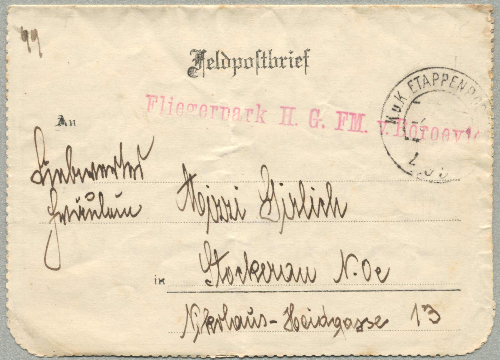1918, Field post letter, from Austria-Hungary to Stockerau, sent by FLIEGERPARK H.G. FML V. BOREVIC, endorsed by K.U.K. ETAPPENPOSTAMT 499 / 6.X.18 handstamp, pink unit cachet, posted from aviation unit in Campoformido/Udine, scarce World