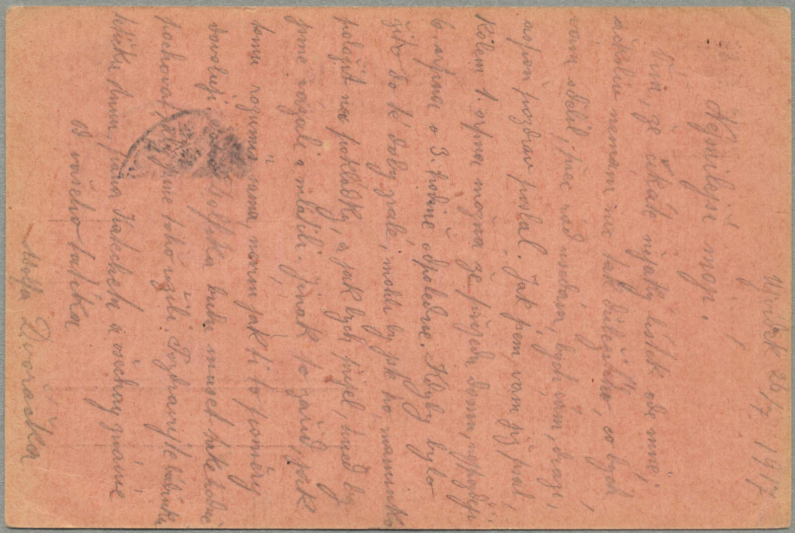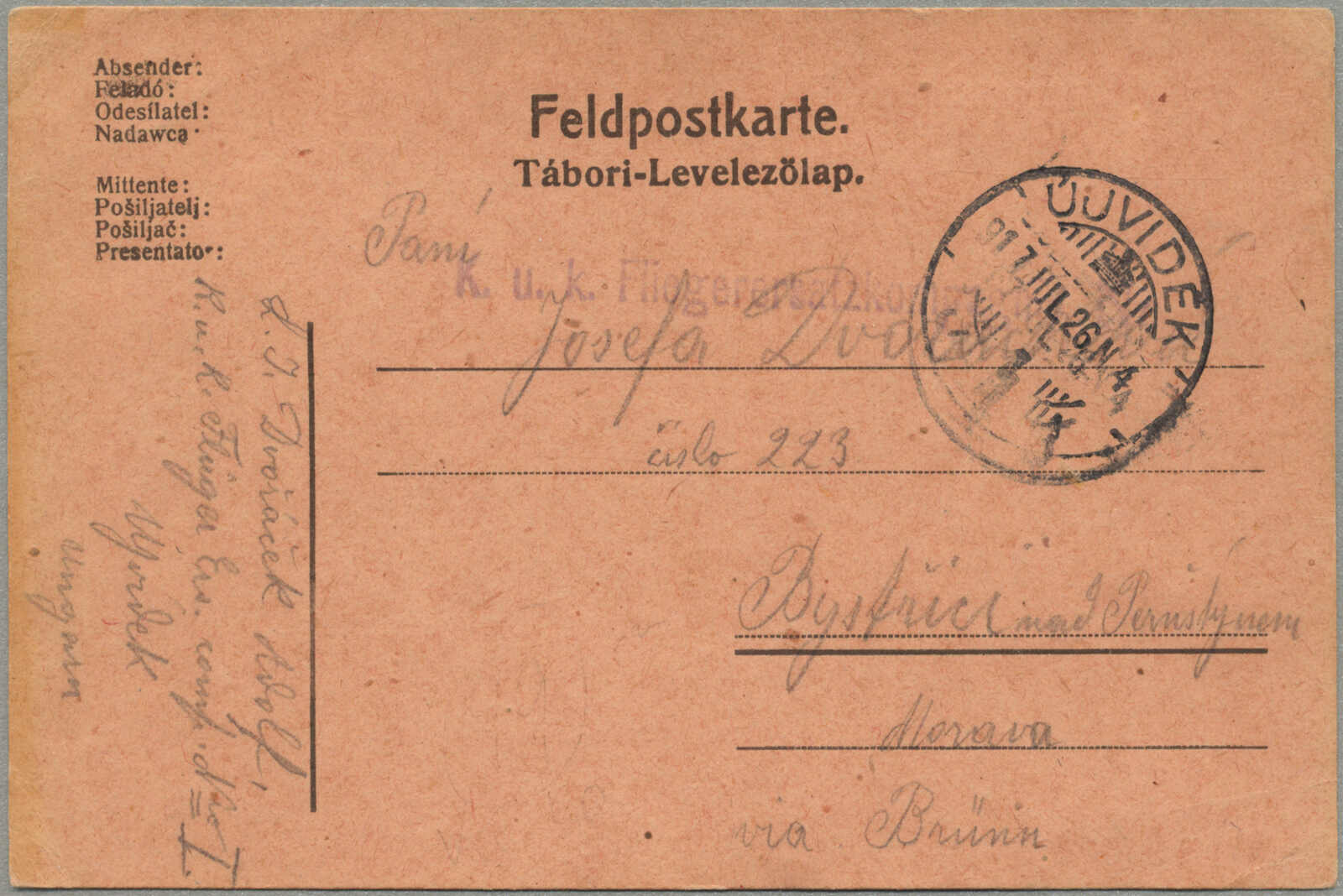 1917, Field post card, from Austria-Hungary to Bystritz, Moravia, sent by FLIEGERERSATZKOMPAGNIE NO. 1, endorsed by UJVIDEK 26.VII.17 handstamp, Hungarian bilingual text TÁBORI-LEVELEZŐLAP / FELDPOSTKARTE, handwritten military