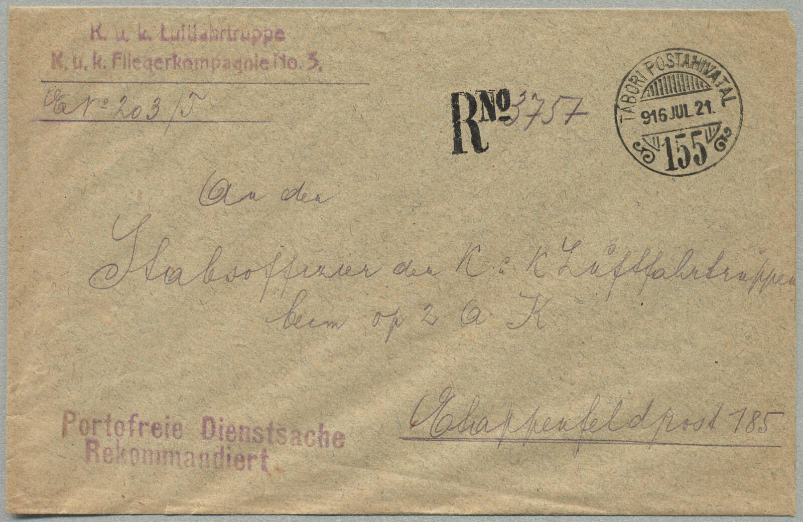 1916, registered field post cover, from Austria-Hungary to k.u.k. Etappenfeldpost 185, sent by k.u.k. Fliegerkompanie No. 3, endorsed by TABORI POSTAHIVATAL 155 21.VII.16 handstamp, PORTOFREIE DIENSTSACHE REKOMMANDIERT marking, internal