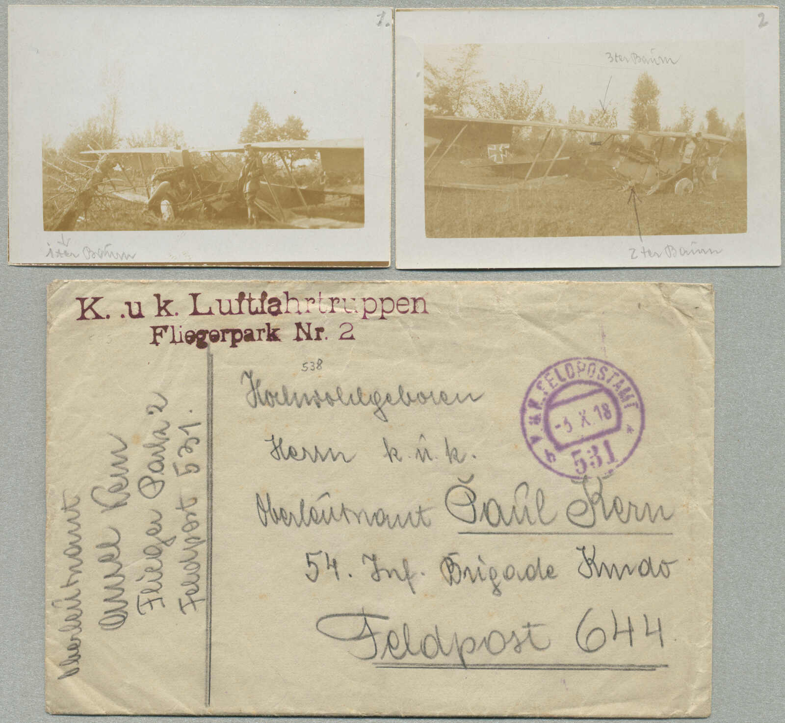1918, field post cover, from Austria-Hungary to Feldpost 644, sent by k.u.k. Fliegerpark No. 2, endorsed by FELDPOSTAMT 531b / 5.X.18 handstamp, military correspondence at the end of World War I, includes photographs of crashed aircraft