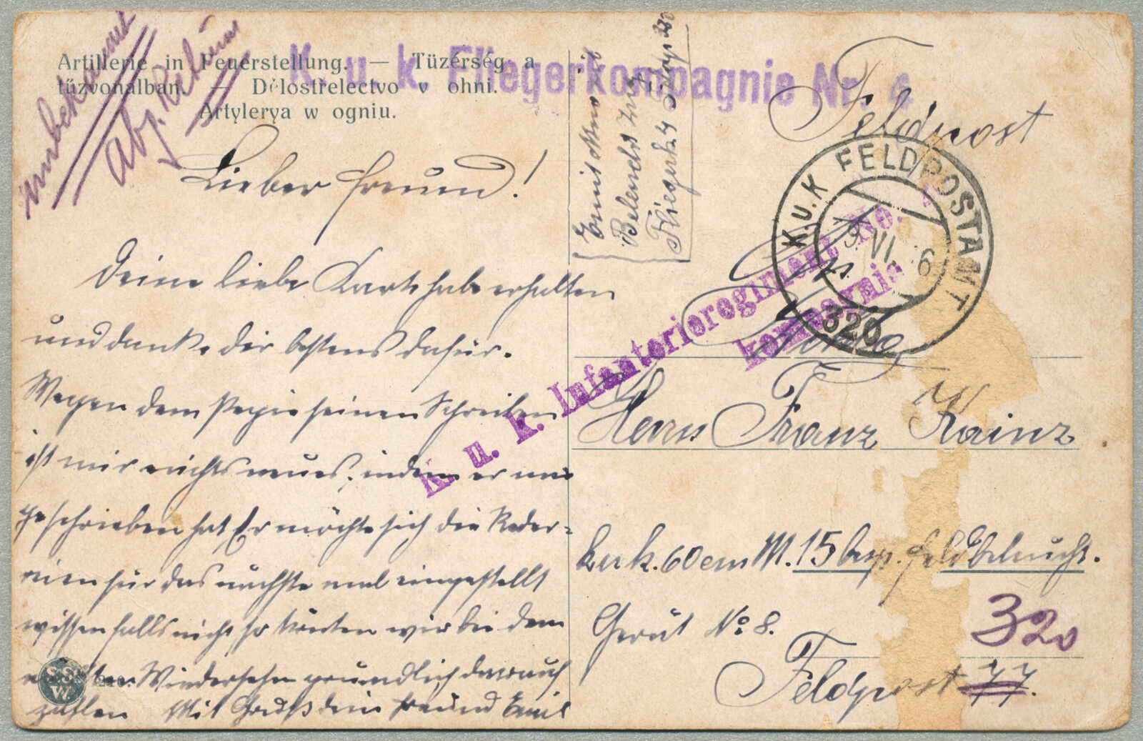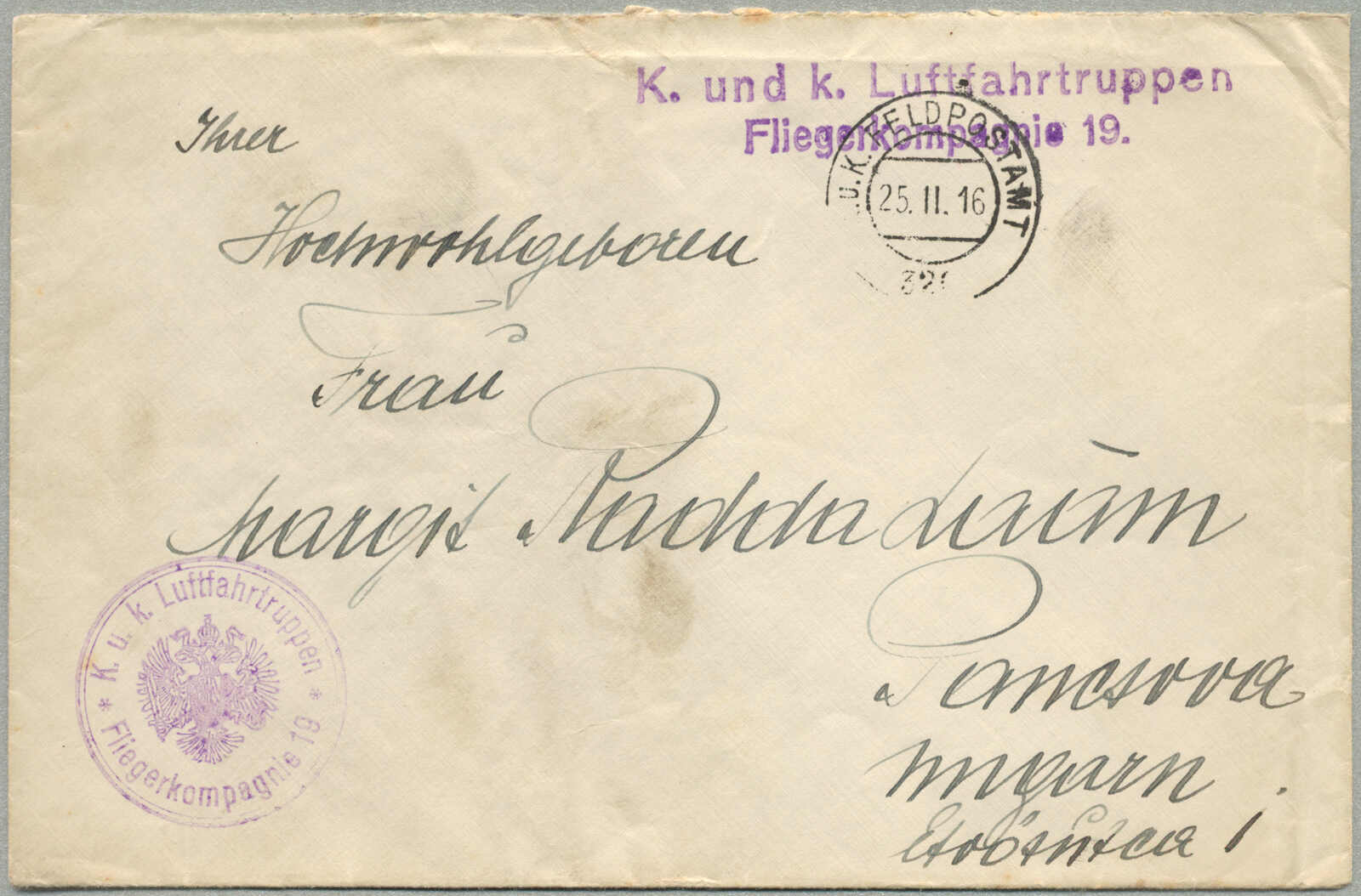1916, Austro-Hungarian military feldpost cover, sent from k.u.k.Feldpostamt 320 to Temesvar, Hungary, dated 25 II. 16, endorsed by violet unit cachet of K.U.K. LUFTFAHRTRUPPEN FLIEGERKOMPAGNIE Nr. 19, circular K.U.K. FELDPOSTAMT 320
