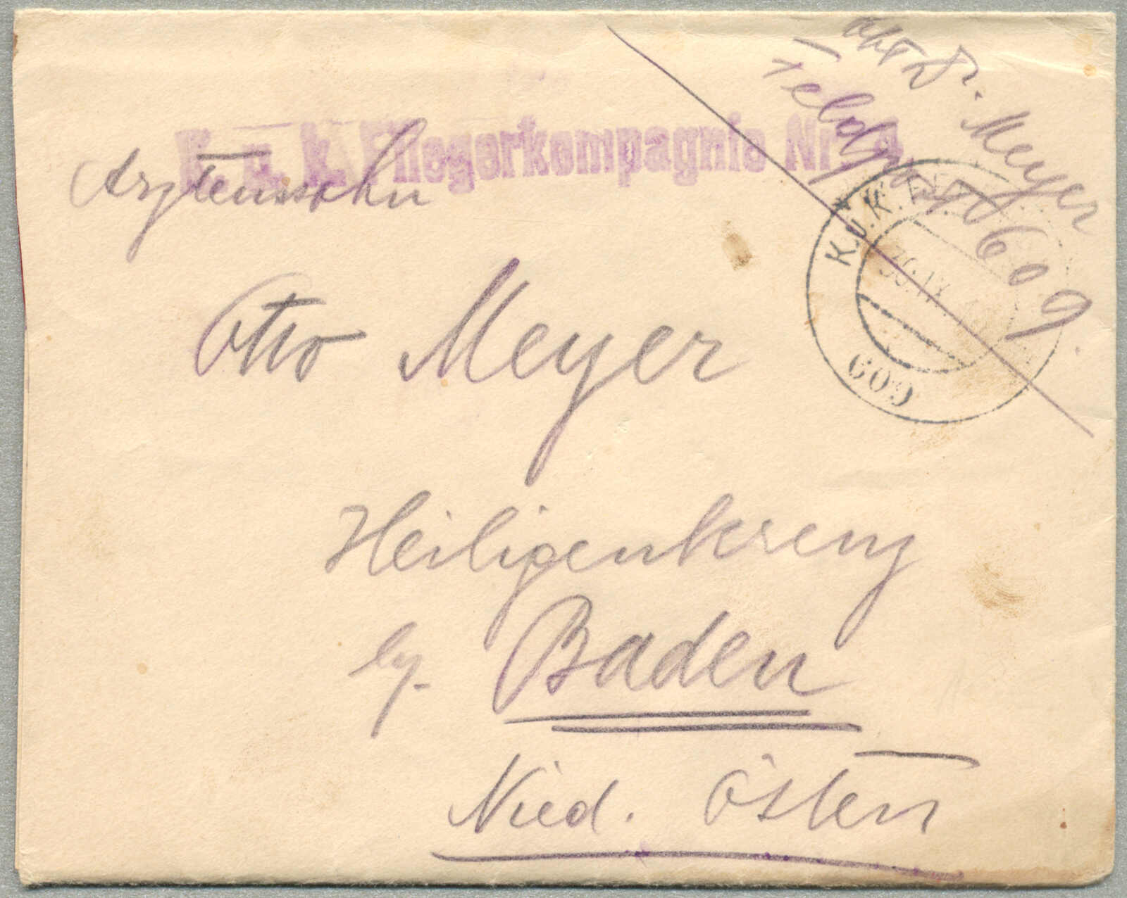 1918, Austro-Hungarian military feldpost cover, sent from FELDPOST 609 to Baden, Austria, dated 30 SEPTEMBER 1918, endorsed by violet unit cachet of k.u.k. FLIEGERKOMPANIE NR. 4, circular FELDPOST 609 postmark, additional manuscript