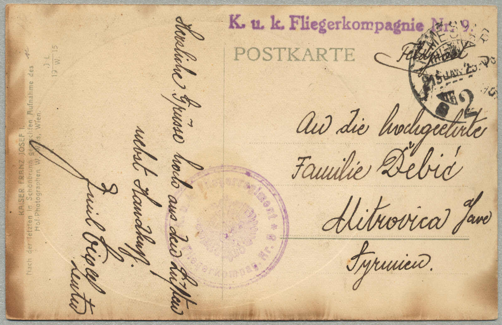 1915, Austro-Hungarian military feldpost card, sent from TEMESVAR to Mitrovica, dated 25 MAY 1915, endorsed by violet unit cachet of k.u.k. FLIEGERKOMPANIE NR. 9, circular TEMESVAR feldpost cancel, additional handstamp markings, World War