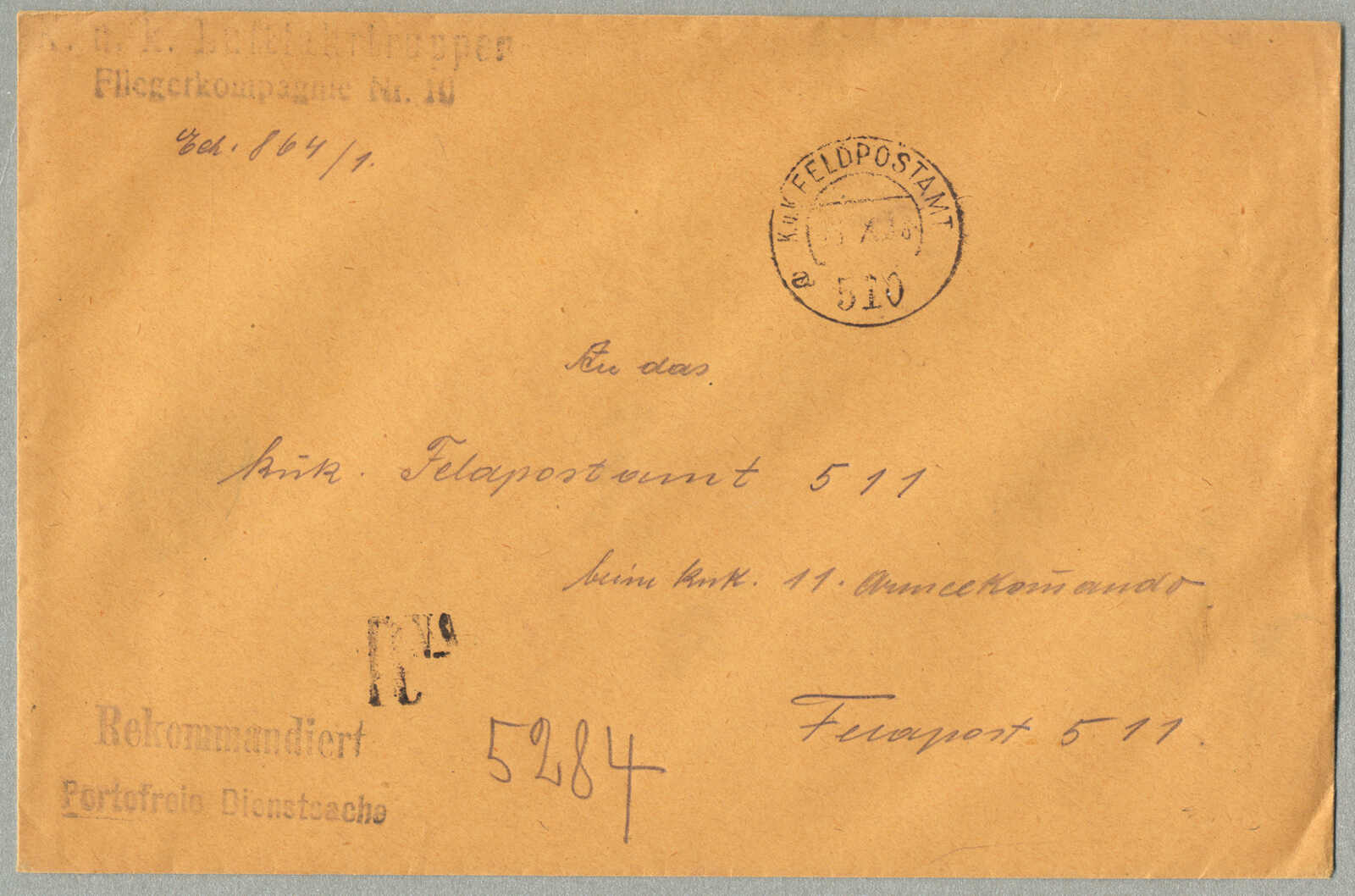 1918, Austro-Hungarian military registered feldpost cover, sent from FELDPOST 510a to FELDPOST 511, dated 28 OCTOBER 1918, endorsed by violet unit cachet of k.u.k. LUFTFAHRTRUPPEN FLIEGERKOMPAGNIE NR. 10, circular FELDPOST 510a postmark,