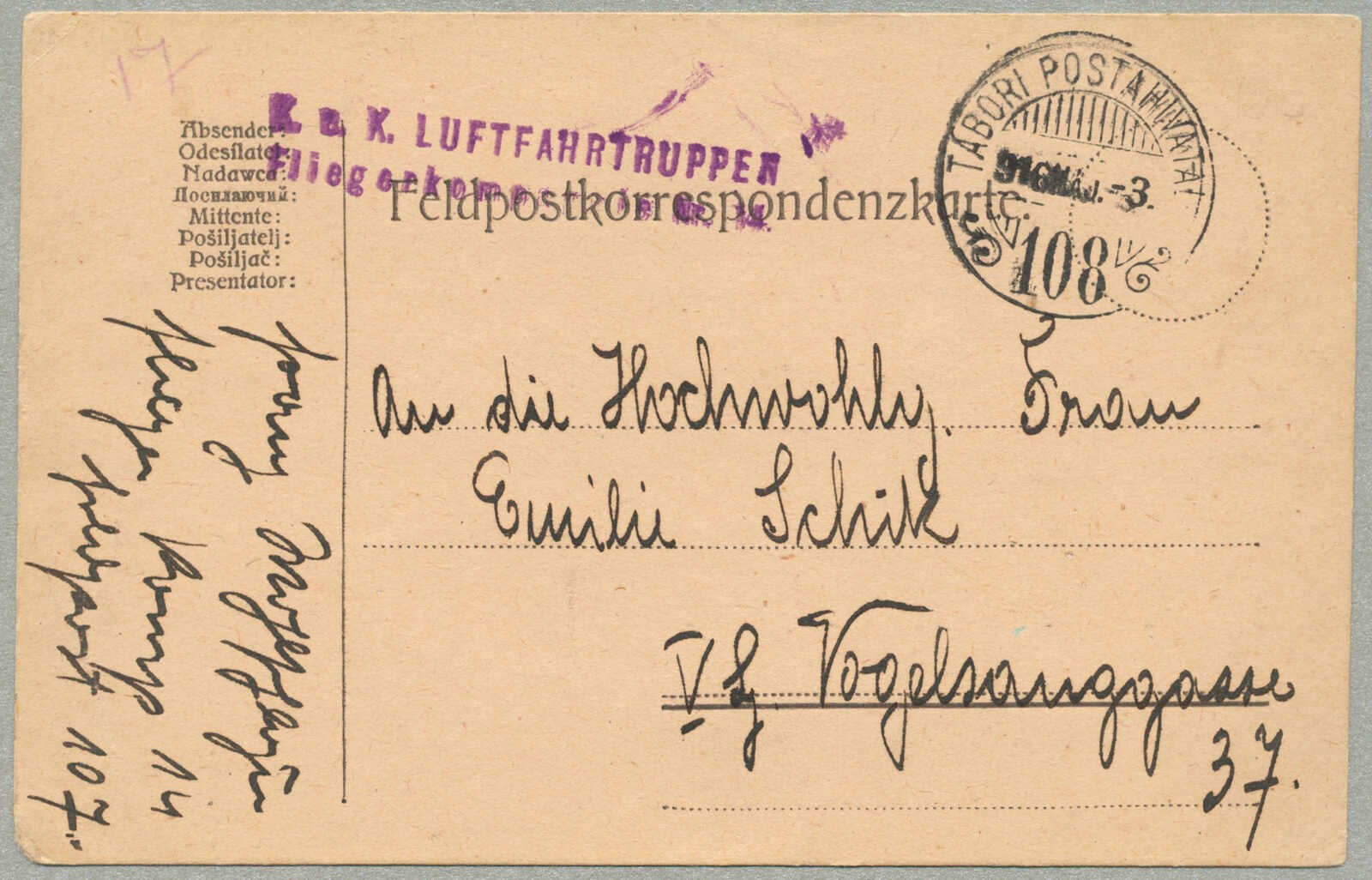 1916, Austro-Hungarian military feldpost card, sent from Tabori Postahivatal 108 to Vienna, dated 3 MAY 1916, endorsed by violet unit cachet of k.u.k. LUFTFAHRTRUPPE FLIEGERKOMPAGNIE Nr. 14, circular TABORI POSTAHIVATAL 108 postmark,