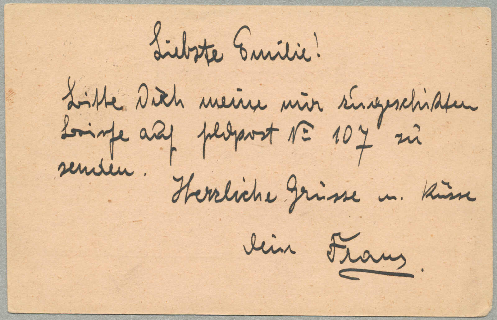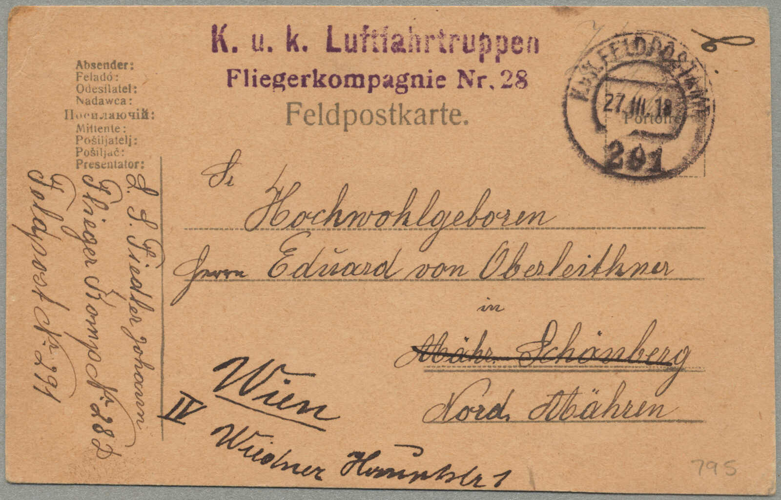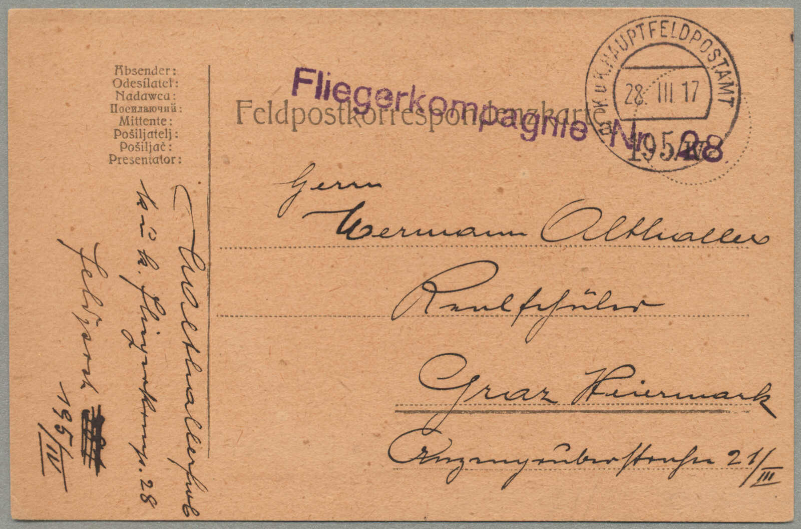 1917, Military field postcard, sent from Fliegerkompanie 28 to Graz, unit cachet FLIEGERKOMPAGNIE Nr. 28, postmarked K.U.K. HAUPTFELDPOSTAMT 195/iv, α 28 III 17, World War I military postal service, fresh and desirable, VF-XF! Estimate