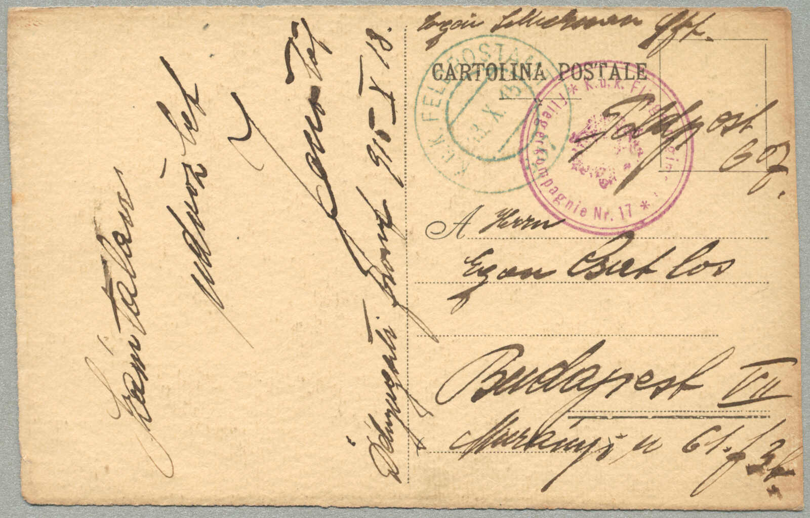 1915, Austro-Hungarian military feldpost card, sent from k.u.k. Feldpostamt 607 to Budapest, dated 18 OCTOBER 1915, endorsed by violet unit cachet of k.u.k. FLIEGERREGIMENT FLIEGERKOMPAGNIE Nr. 17, circular k.u.k. FELDPOSTAMT 607 postmark