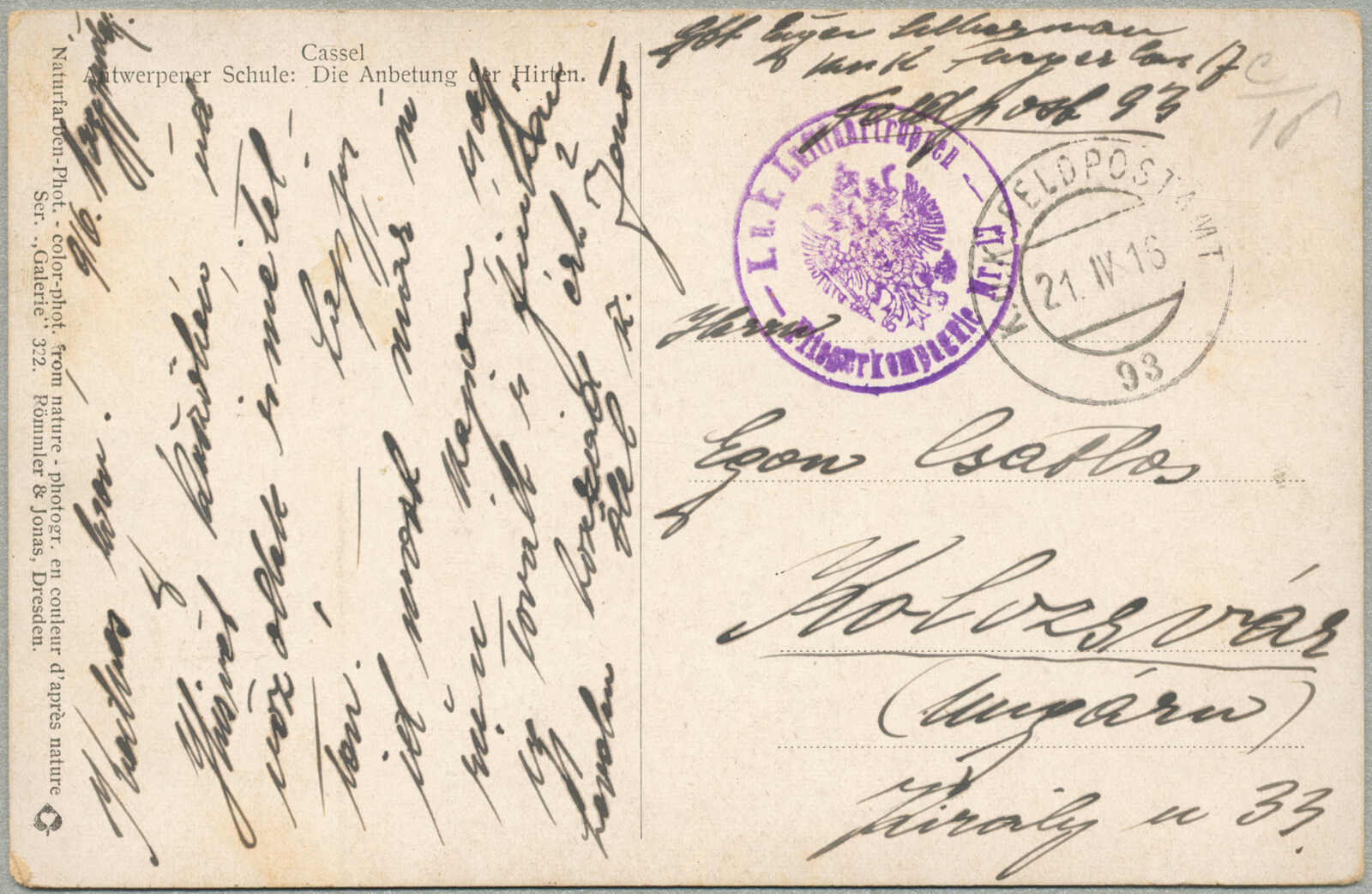 1916, Austro-Hungarian military feldpost card, sent from k.u.k. Feldpostamt 93 to Kolozsvar, Hungary, dated 21 APRIL 1916, endorsed by violet unit cachet of K.U.K. LUFTFAHRTRUPPEN FLIEGERKOMPAGNIE Nr. 17, circular K.U.K. FELDPOSTAMT 93