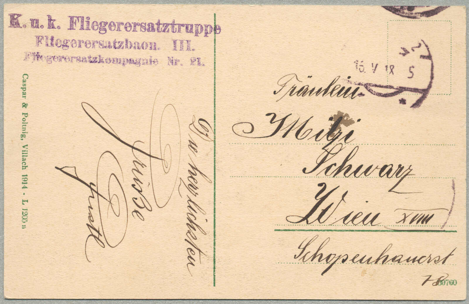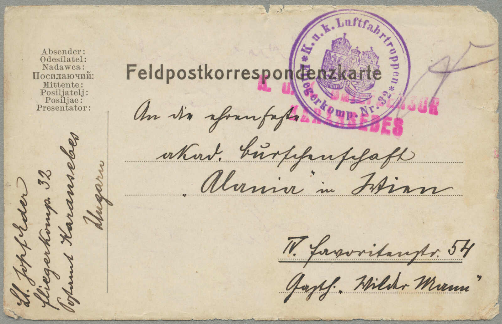 1916, fieldpost card from K.u.k. Luftfahrtruppen Fliegerkompanie Nr. 32 in Karansebes (Hungary) to Vienna, violet unit cachet K.U.K. LUFTFAHRTRUPPEN FLIEGERKOMP. NR. 32, additional violet censor marking K.U.K. BRIEFZENSUR, manuscript