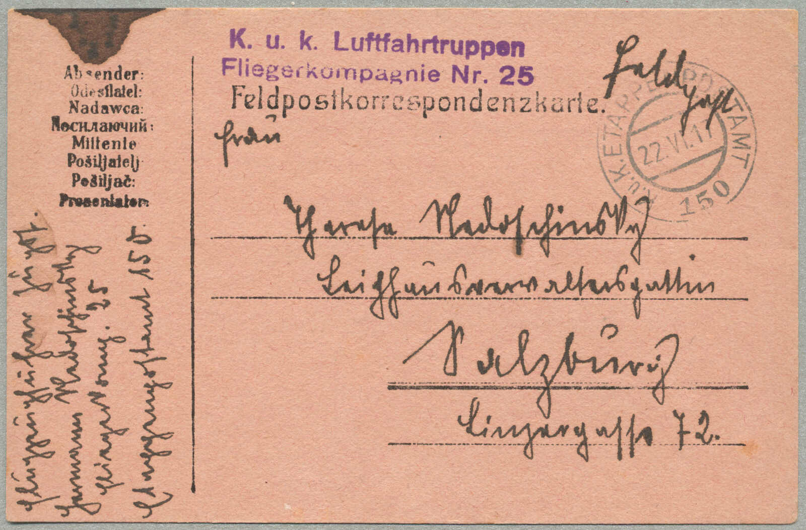 1917, Military field postcard, sent from Etappenpostamt Nr. 150 to Salzburg, unit cachet K.U.K. LUFTFAHRTRUPPEN FLIEGERKOMPAGNIE Nr. 25, postmarked ETAPPENPOSTAMT Nr. 150 22 VI 17, handwritten message, World War I military postal service,