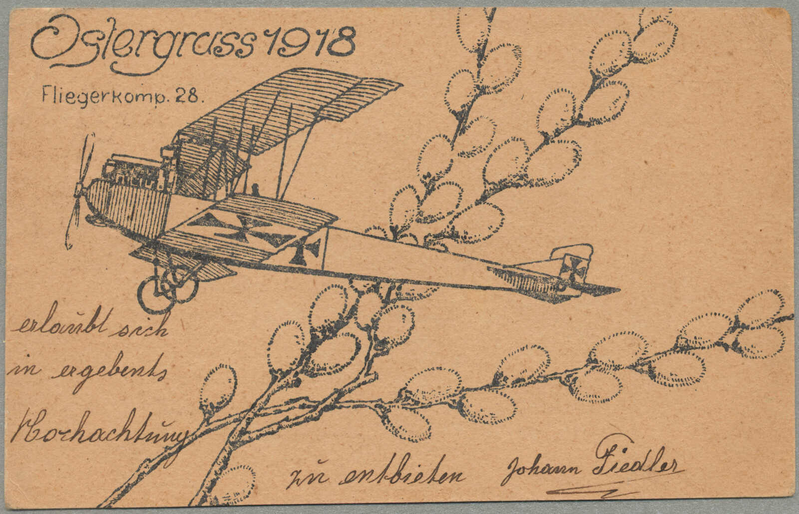 1918, Military Easter postcard, sent from Fliegerkompanie 28 to Vienna, illustrated with an aviation-themed Easter greeting, unit cachet K.U.K. LUFTFAHRTRUPPEN FLIEGERKOMPAGNIE Nr. 28, postmarked FELDPOST 291 / 27 III 18, handwritten