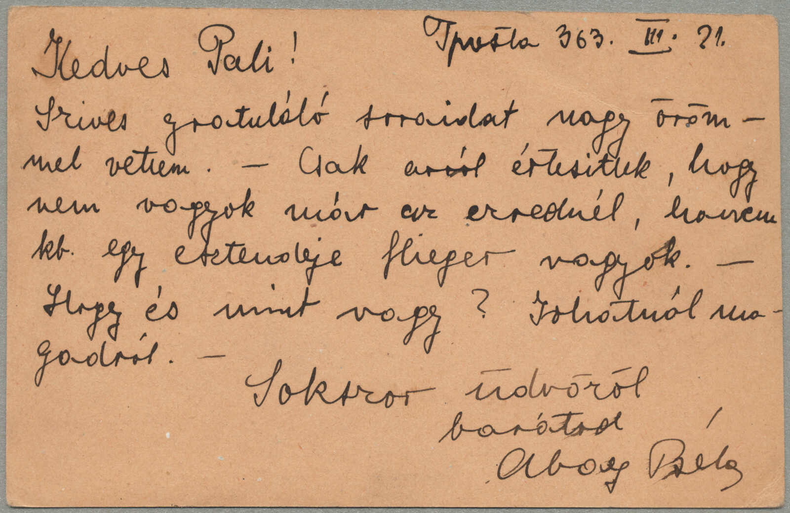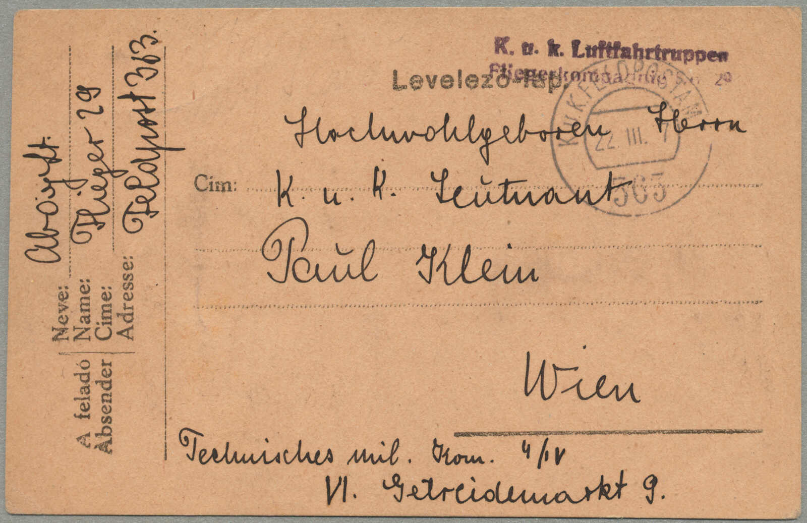 1917, Military field postcard, sent from Fliegerkompanie 29, to Vienna, unit cachet K.U.K. LUFTFAHRTRUPPEN FLIEGERKOMPAGNIE Nr. 29, postmarked FELDPOST 363 / 22 III 17, World War I military postal service, very fresh and desirable, VF-XF!