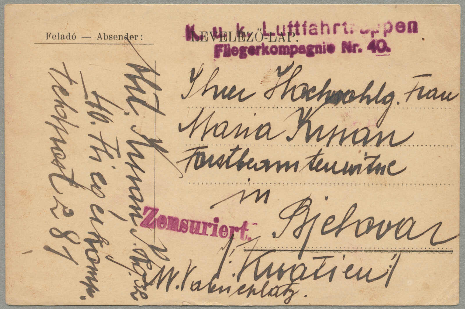 1914-18, fieldpost card from K.u.k. Luftfahrtruppen Fliegerkompanie Nr. 40 to Bjelovar, violet unit cachet K.U.K. LUFTFAHRTRUPPEN FLIEGERKOMPAGNIE NR. 40, violet censor marking ZENSURIERT, endorsed by sender from Fliegerkompanie 281, no