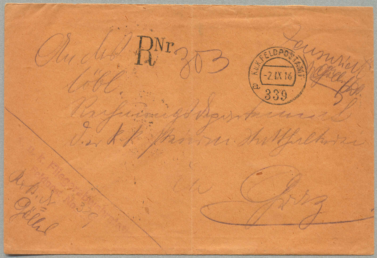 1916, Registered official cover from K.u.k. Fliegerabwehrstation (Aircraft Security Station), handstamp FLIEGERABWEHRSTATION, sent via FELDPOST 339g dated 2 IX 16, black registration handstamp R Nr 303, large official manuscript note
