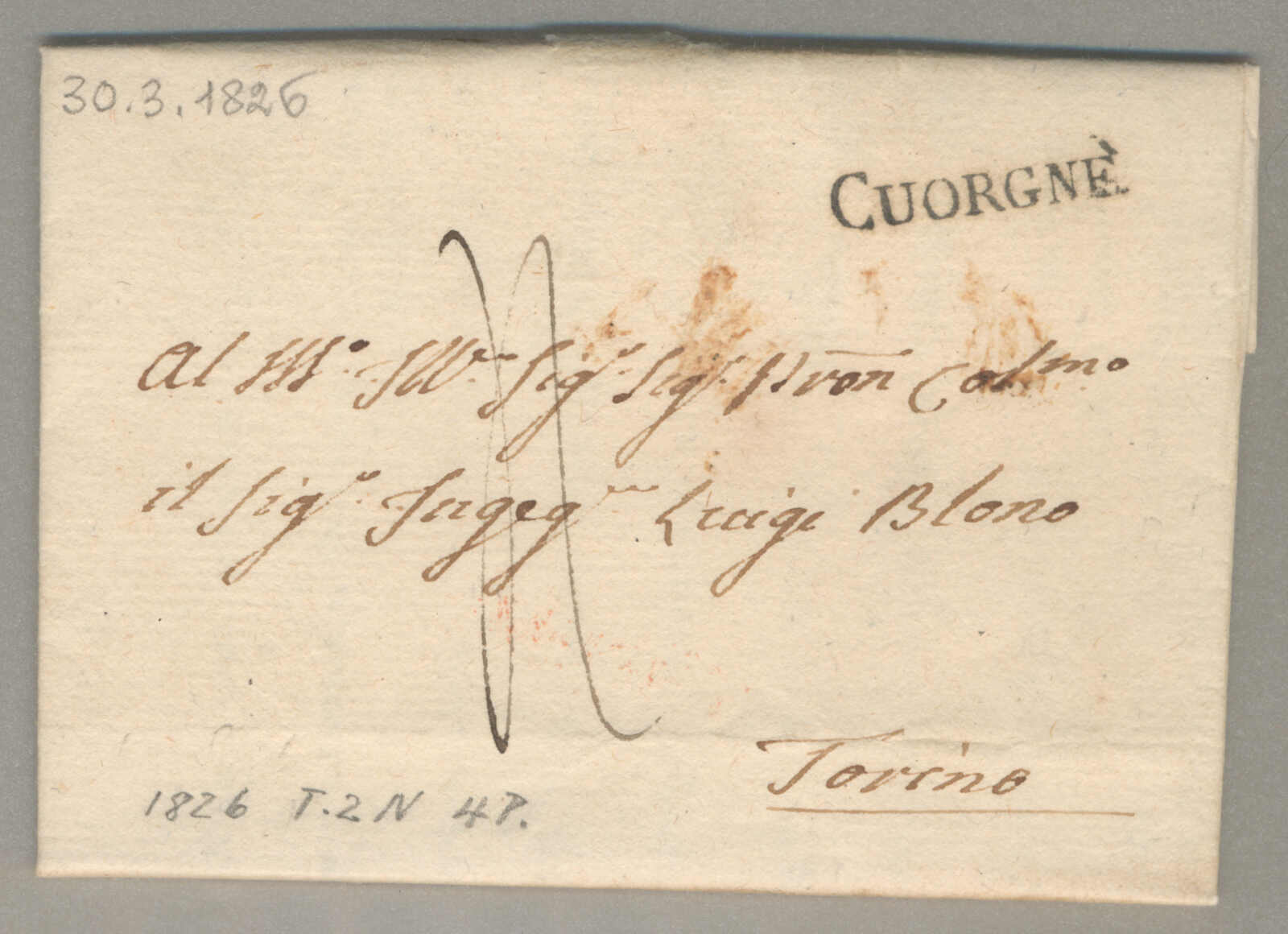 1826, with neatly strike of Cuorgne, on folded letter, ex Provera, XF! Estimate 100€. (Image) (imagea)