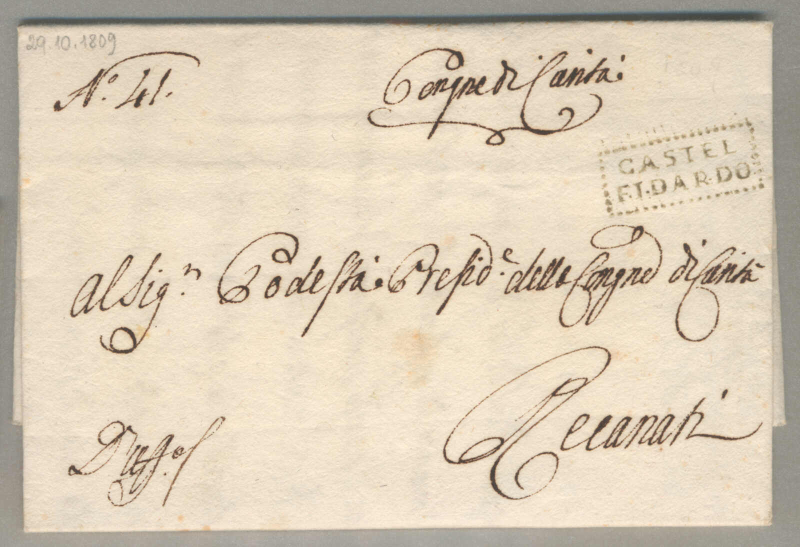 1809, with neatly strike of Castel di Dardo, on folded letter, ex Provera, XF! Estimate 120€. (Image) (imagea)