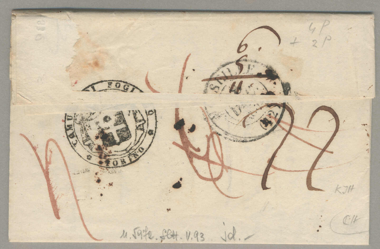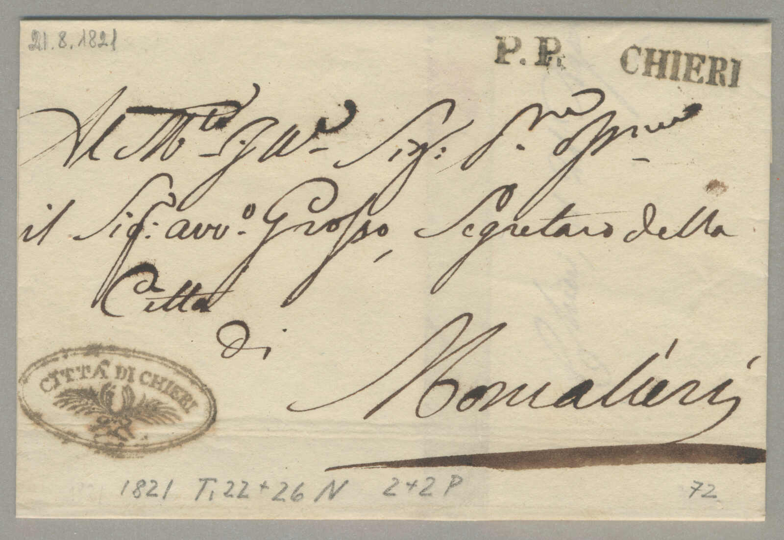 1821, with neatly strike of Chieri, on folded letter, ex Provera, XF! Estimate 100€. (Image) (imagea)