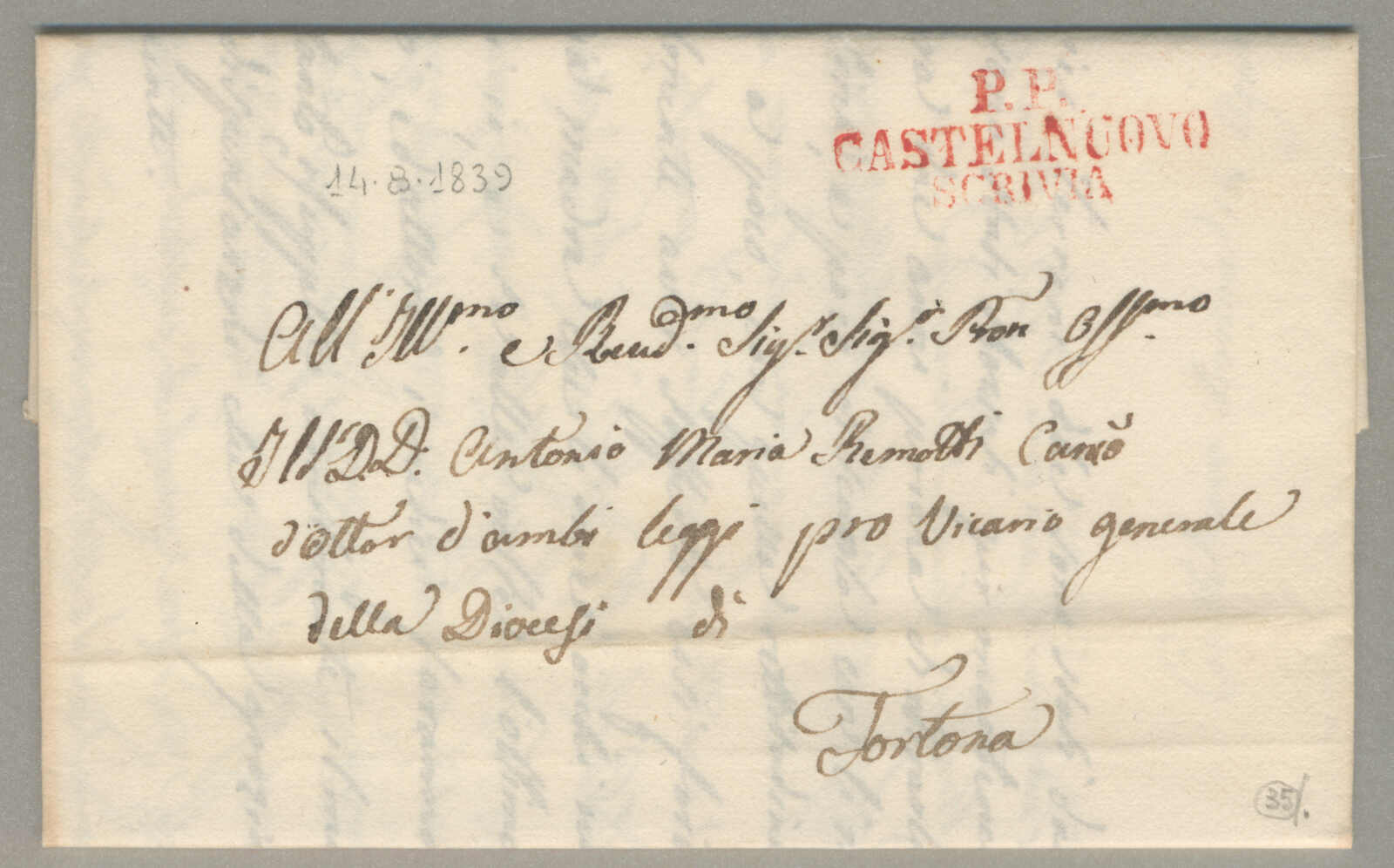1839, with neatly strike of Castelnuovo Scrivia, on folded letter, ex Provera, XF! Estimate 400€. (Image) (imagea)