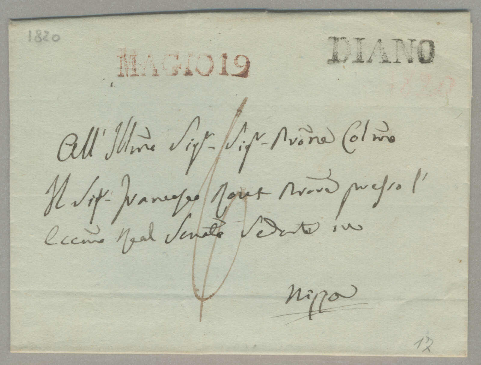 1820, with neatly strike of Diano, on folded letter, ex Provera, XF! Estimate 300€. (Image) (imagea)