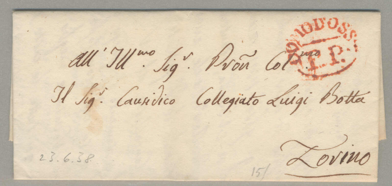 1838, with neatly strike of Domodoss(ola), on folded letter, ex Provera, XF! Estimate 120€. (Image) (imagea)