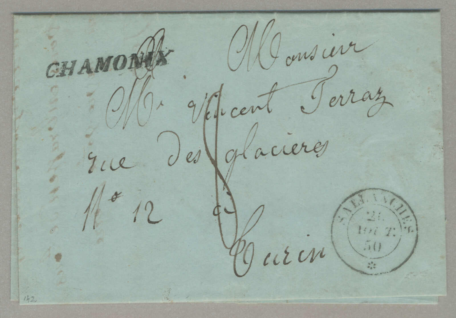 1850, with neatly strikes of Chamonix and Sallanches, on folded letter, ex Provera, XF! Estimate 1.200€. (Image) (imagea)