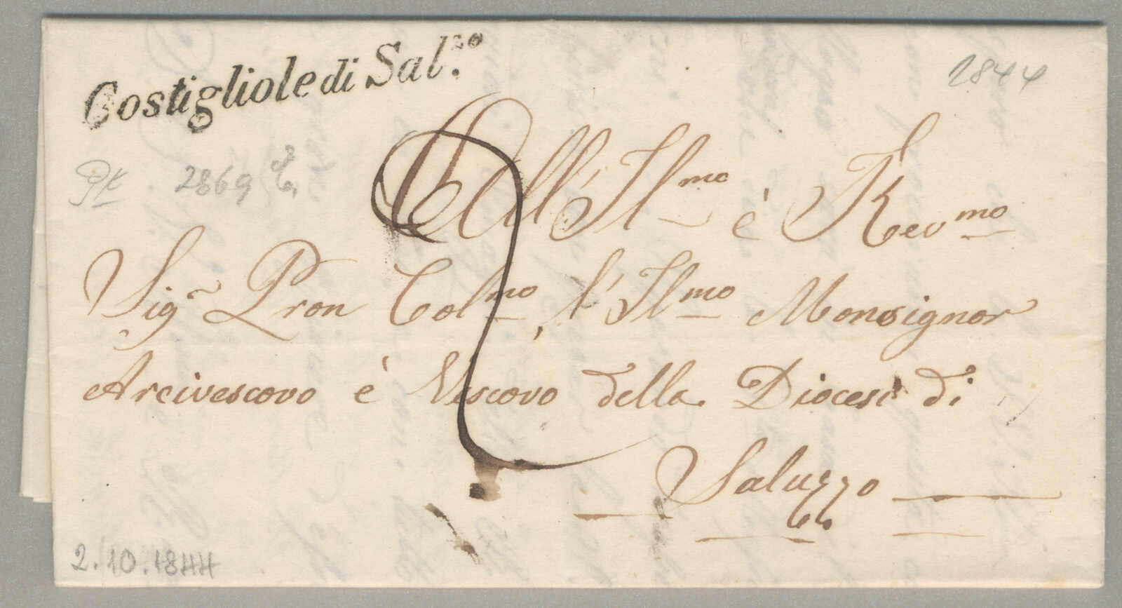 1844, with neatly strike of Costigliole di Sal(uzzo), on folded letter, ex Provera, XF! Estimate 120€. (Image) (imagea)