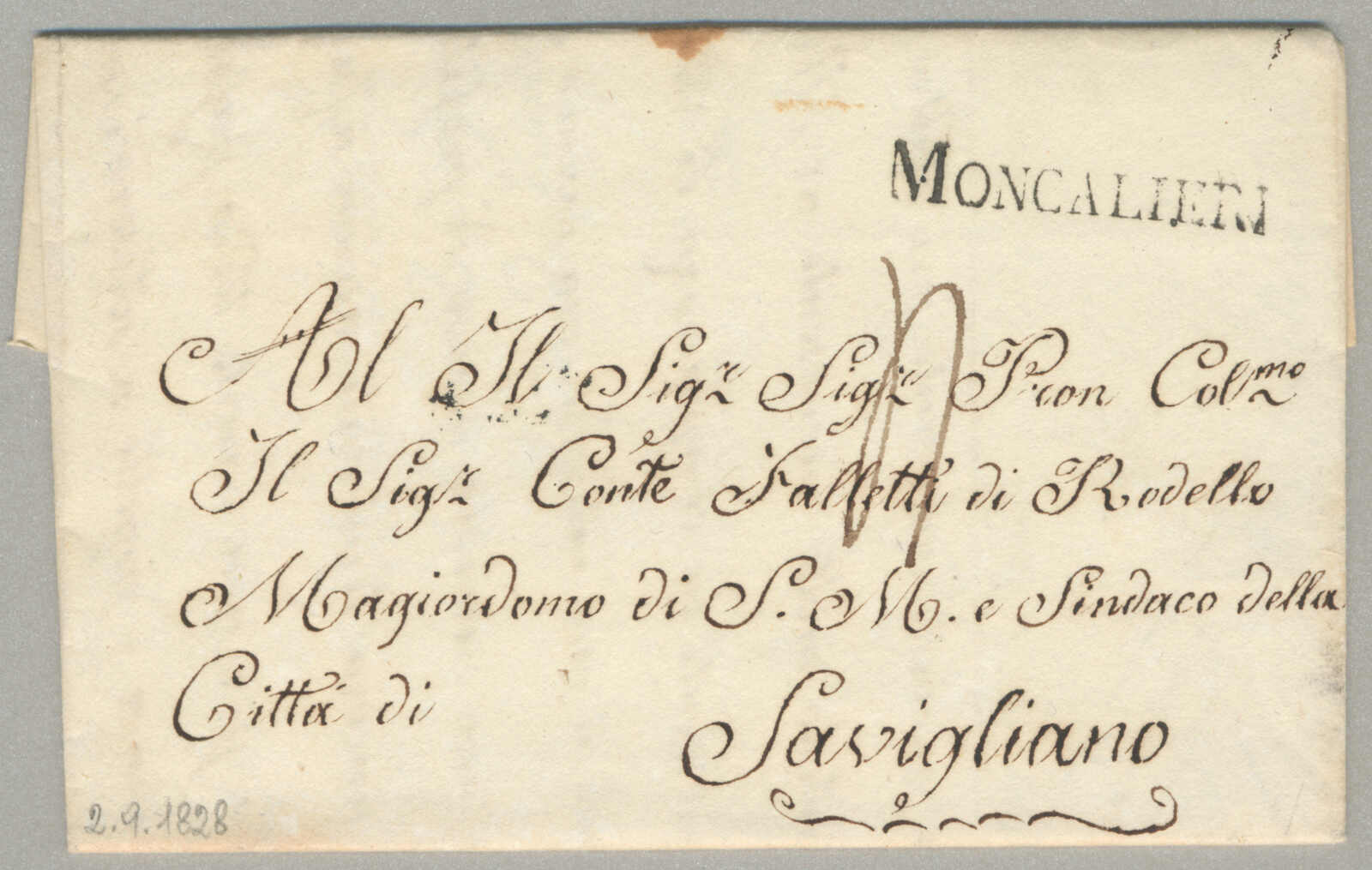 1828, with neatly strike of Moncalieri, on folded letter, ex Provera, XF! Estimate 100€. (Image) (imagea)