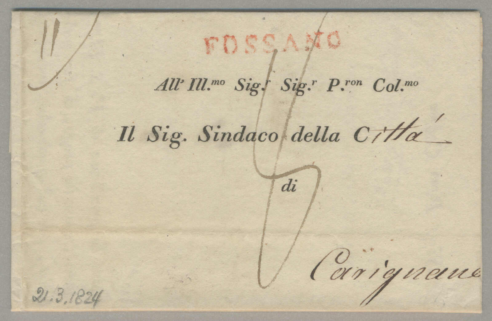 1824, with neatly strike of Fossano, on folded letter, ex Provera, XF! Estimate 100€. (Image) (imagea)