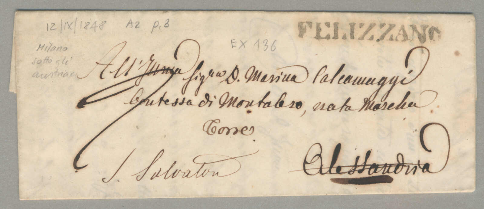 1848, with neatly strike of Felizzano, on folded letter, ex Provera, XF! Estimate 400€. (Image) (imagea)
