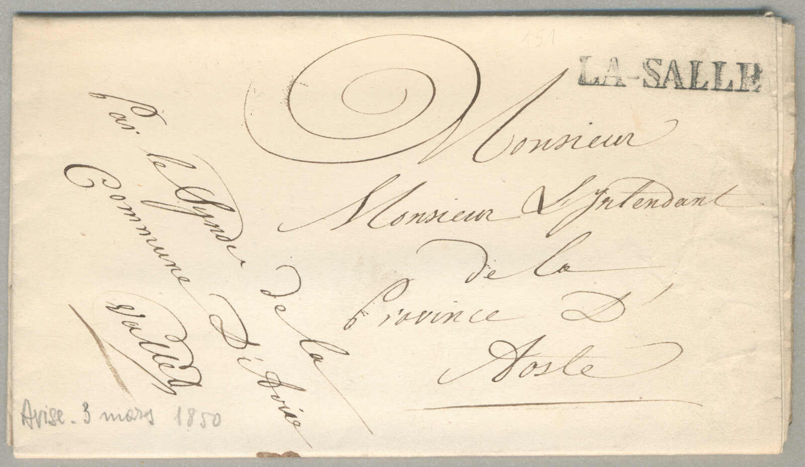 1850, with neatly strike of La Salle, on folded letter, ex Provera, XF! Estimate 800€. (Image) (imagea)