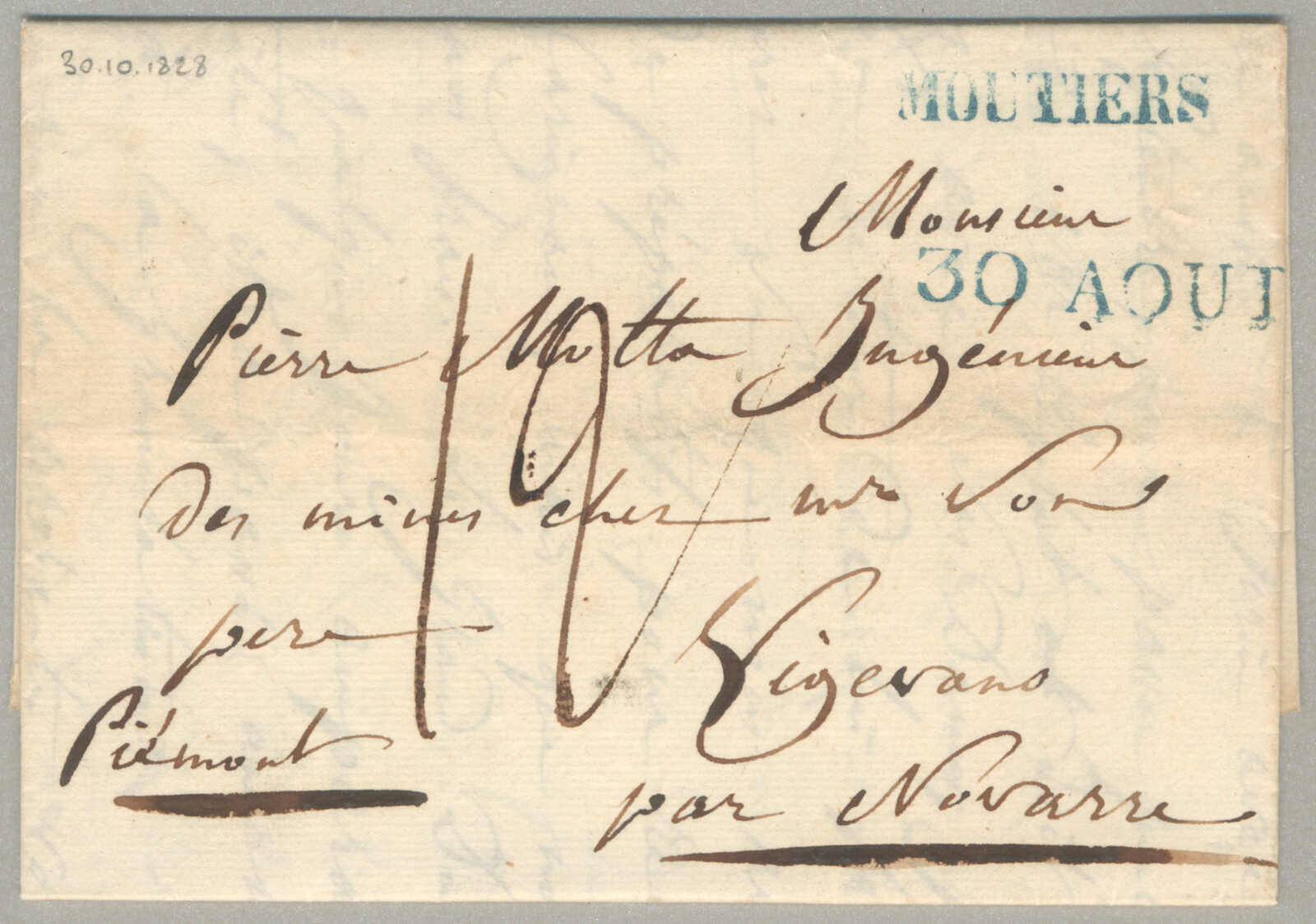 1828, with neatly strike of Moutiers, on folded letter, ex Provera, XF! Estimate 300€. (Image) (imagea)