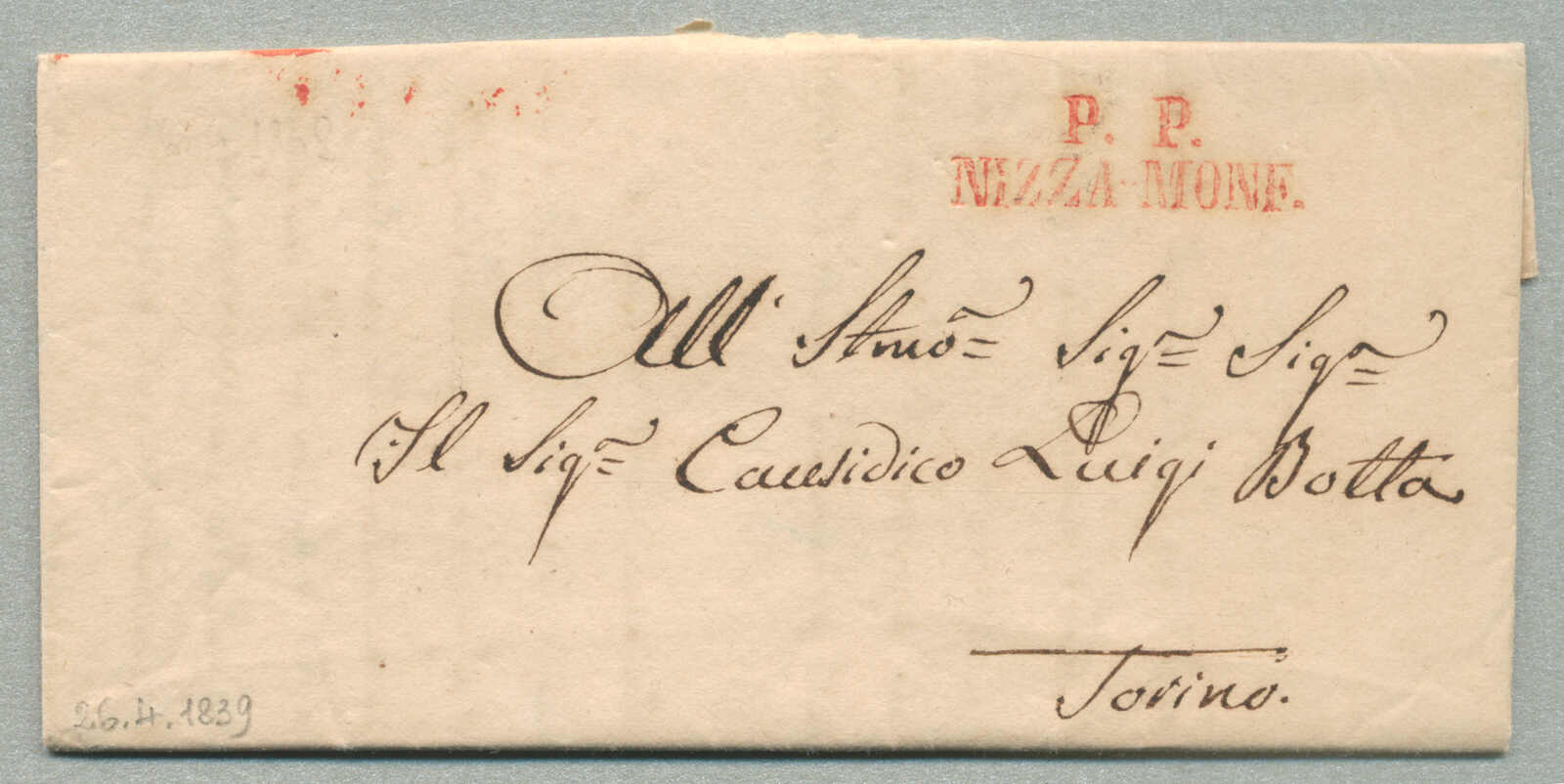 1839, with neatly strike of Nizza Monf(errato), on folded letter, ex Provera, XF! Estimate 120€. (Image) (imagea)