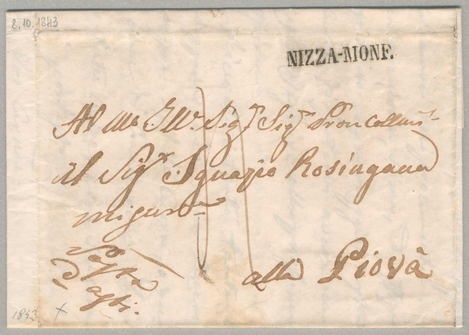 1843, with neatly strike of Nizza-Mone, on folded letter, ex Provera, XF! Estimate 120€. (Image) (imagea)