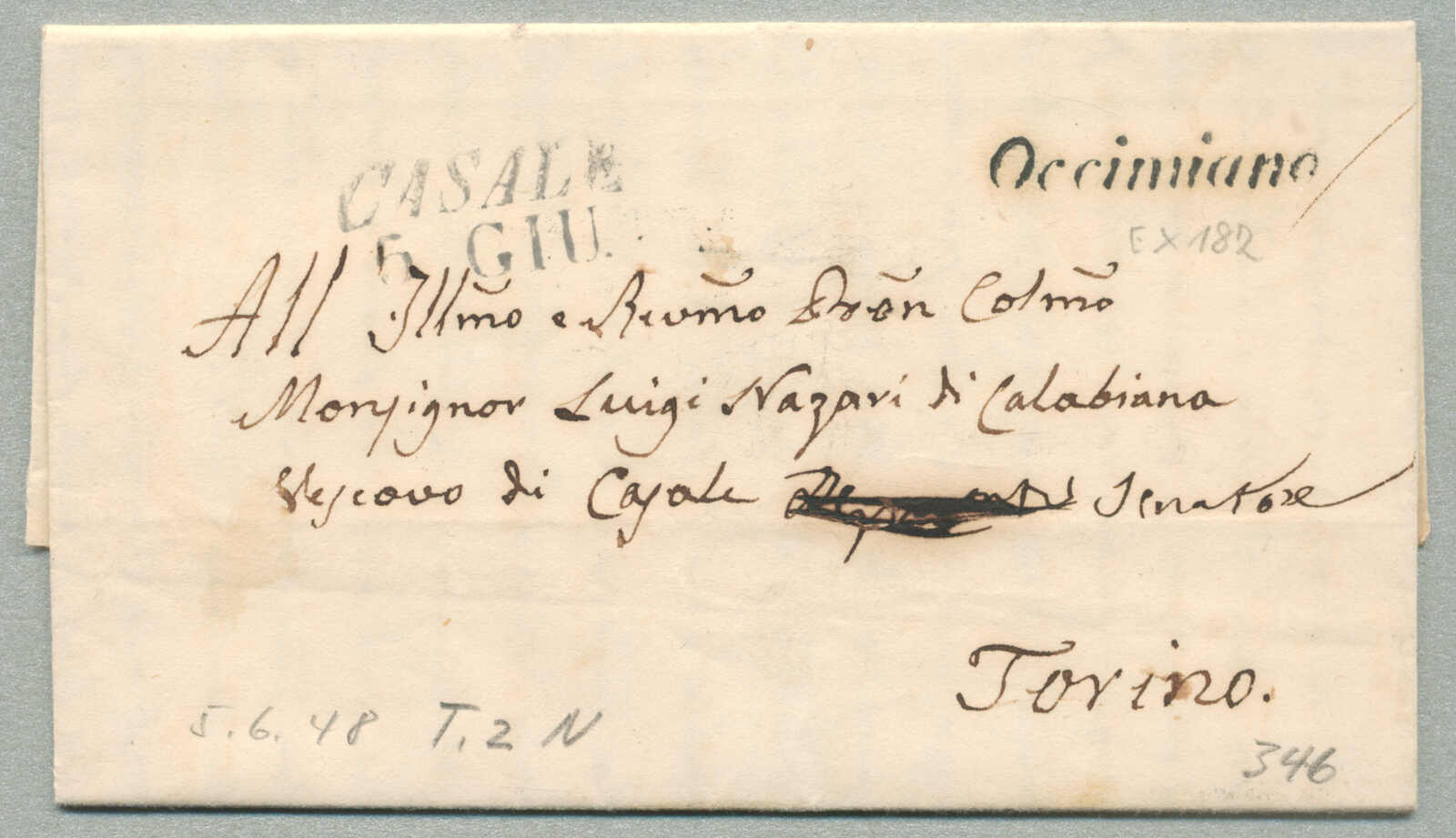 1848, with neatly strike of Occimiano, on folded letter, ex Provera, XF! Estimate 120€. (Image) (imagea)
