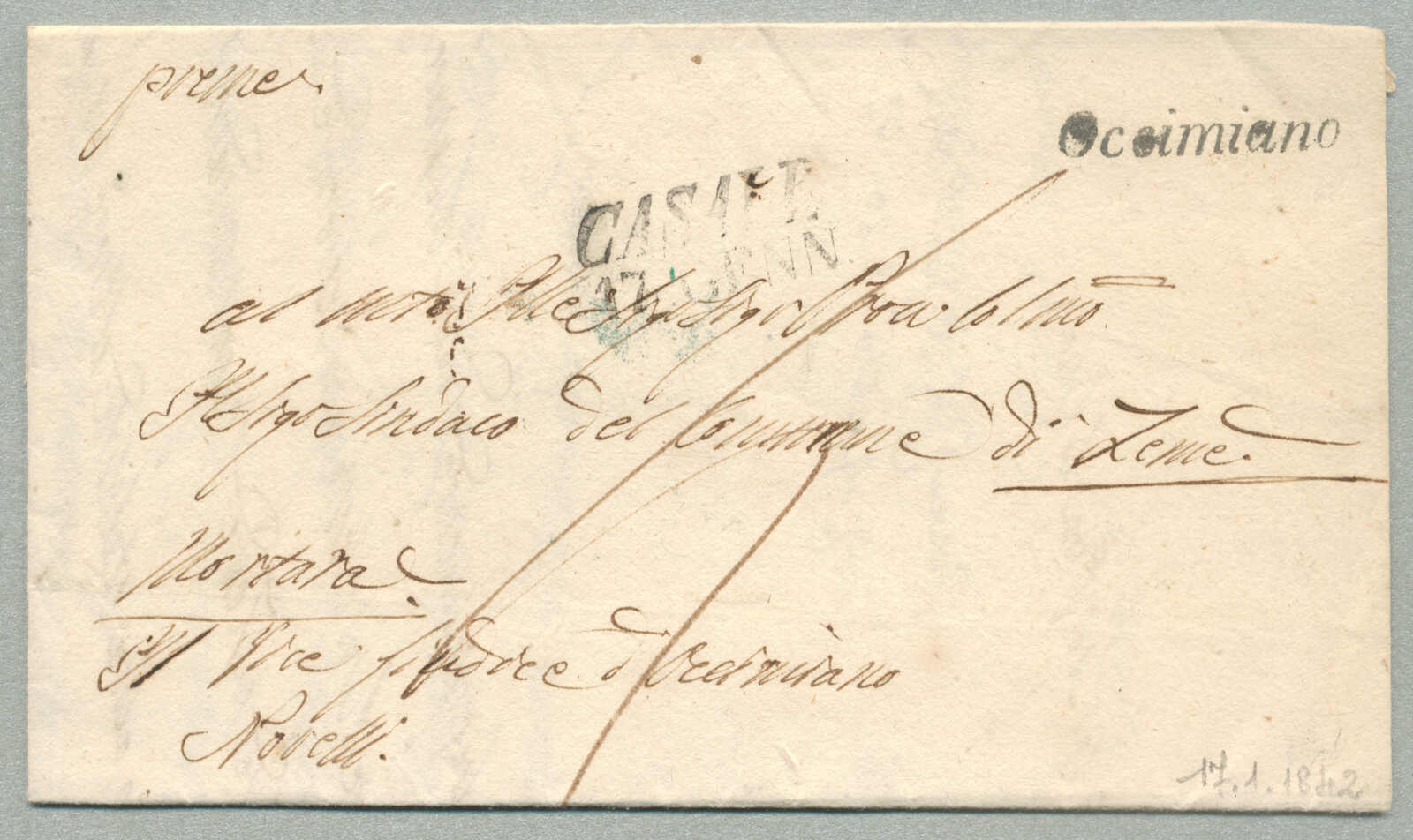 1842, with neatly strike of Occimiano, on folded letter, ex Provera, XF! Estimate 800€. (Image) (imagea)