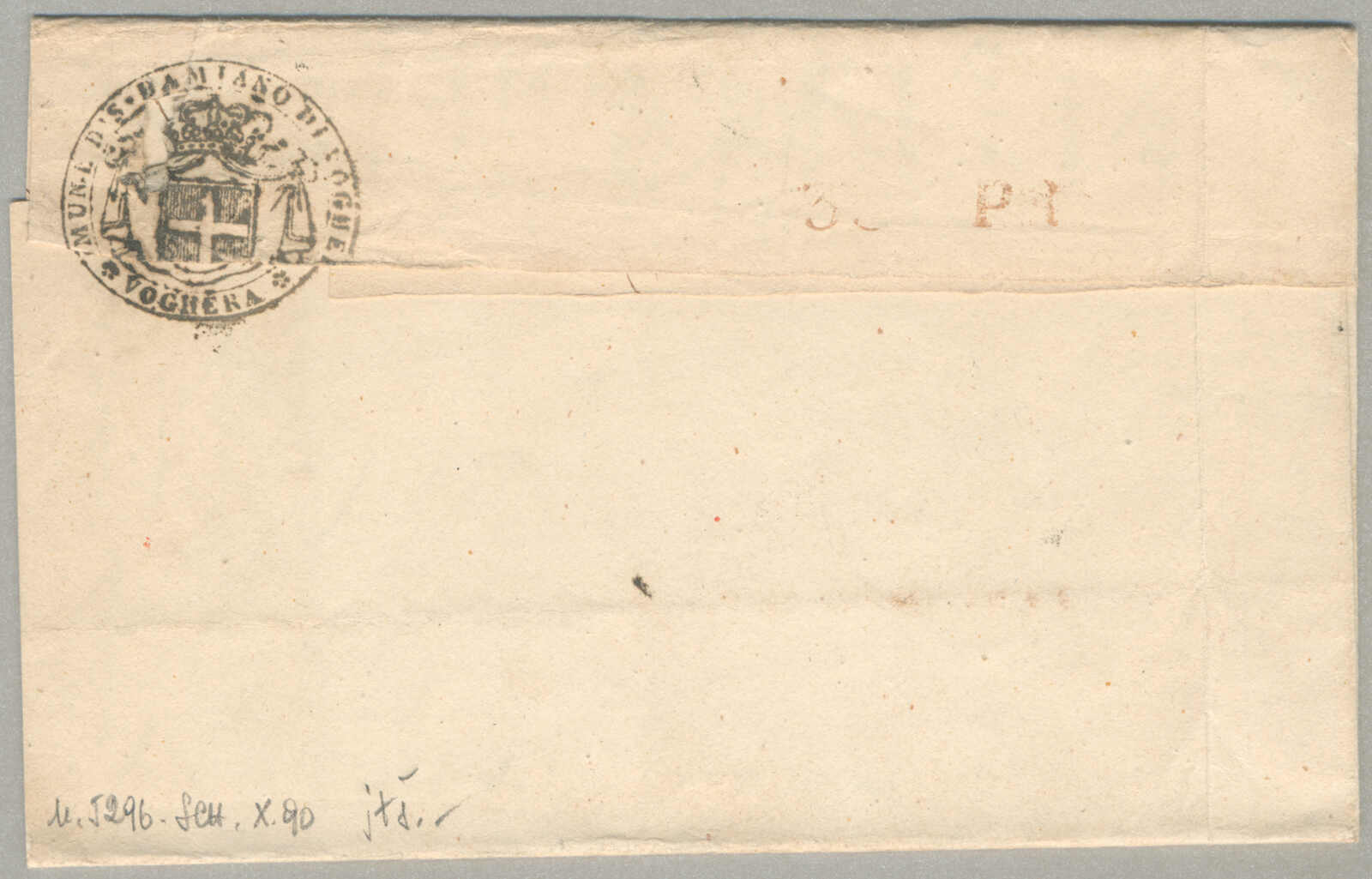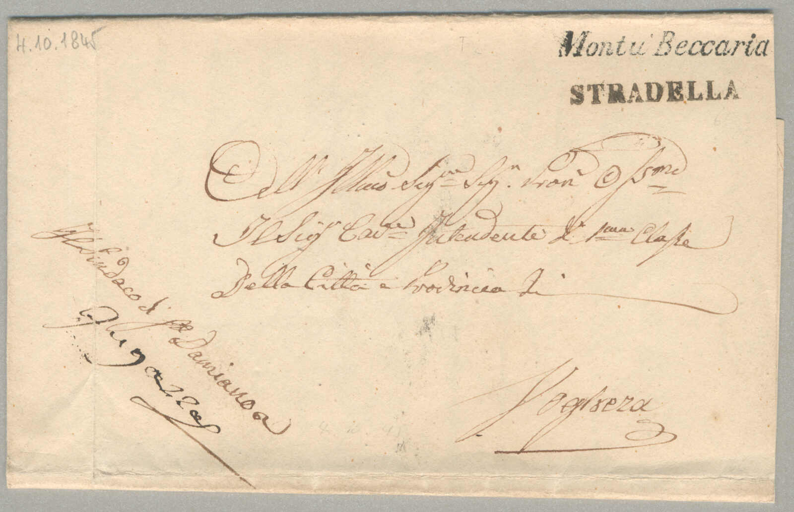 1845, with neatly strike of Montu Beccaria and Stradella, on folded letter, ex Provera, XF! Estimate 700€. (Image) (imagea)
