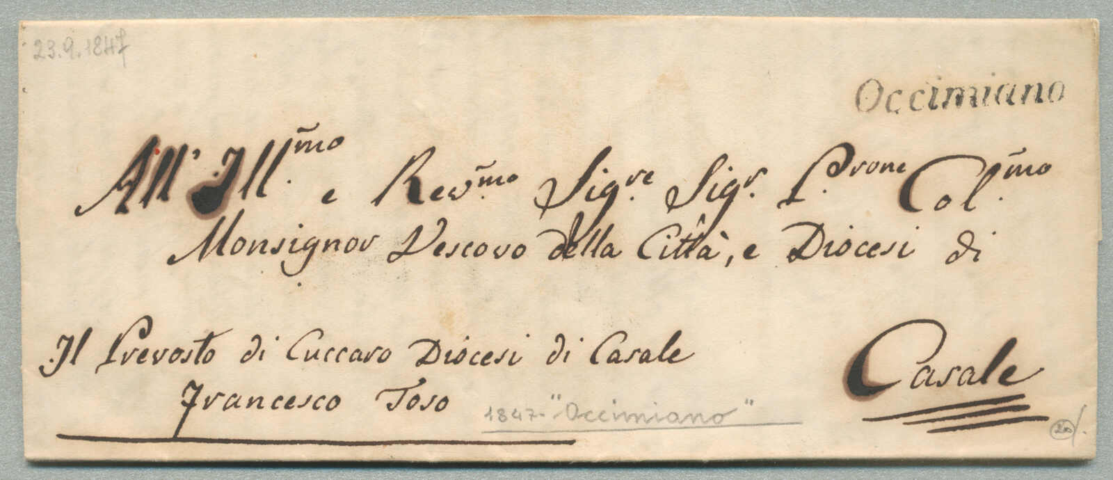 1847, with neatly strike of Occimiano, on folded letter, ex Provera, XF! Estimate 120€. (Image) (imagea)