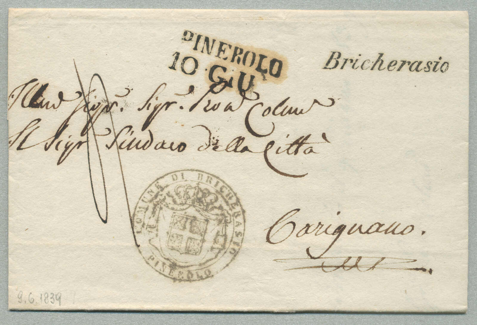 1834, with neatly strike of Pinerolo and Bricherasio, on folded letter, ex Provera, XF! Estimate 160€. (Image) (imagea)