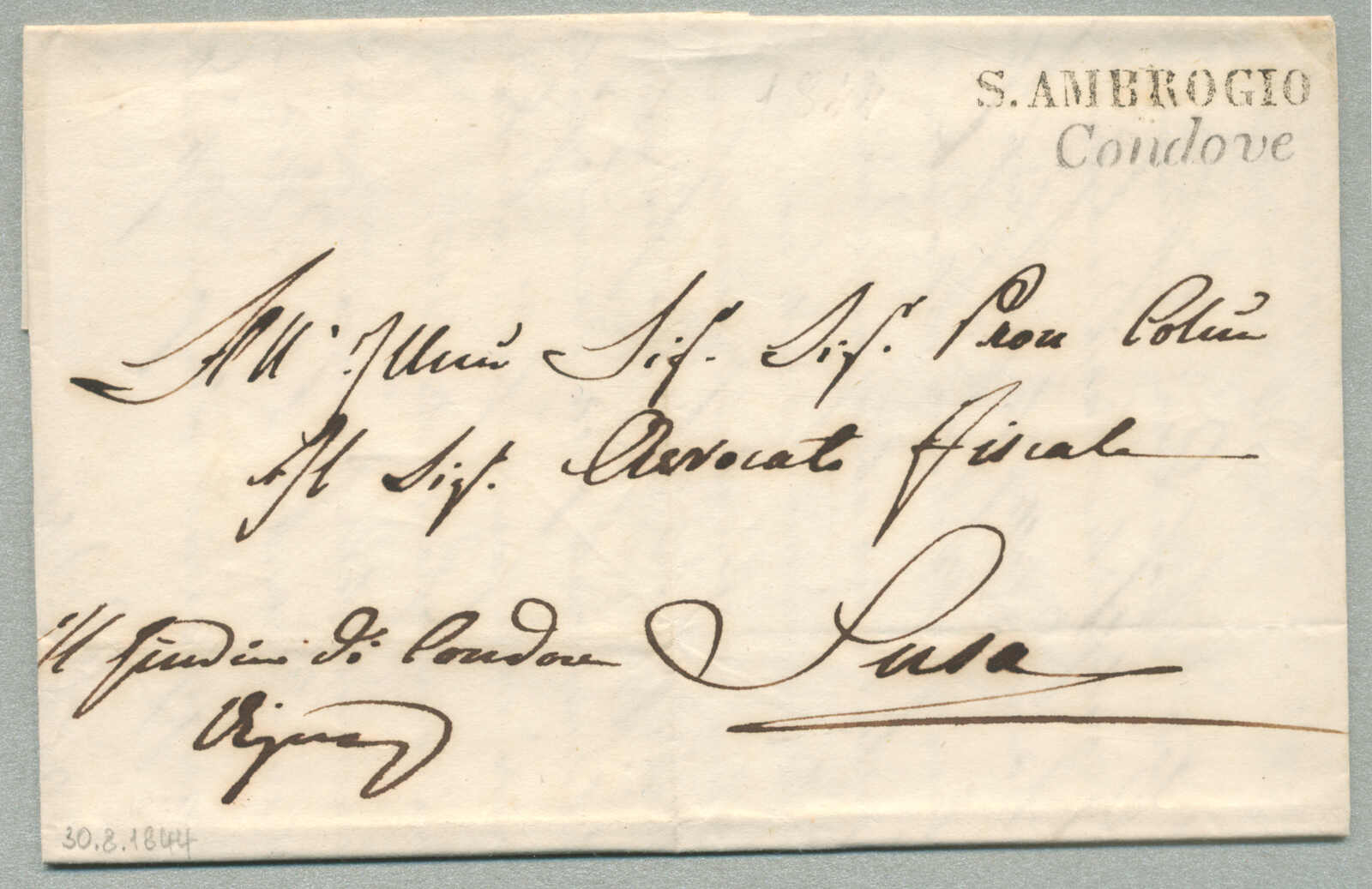 1844, with neatly strike of S. Ambrogio and Condove, on folded letter, ex Provera, XF! Estimate 160€. (Image) (imagea)