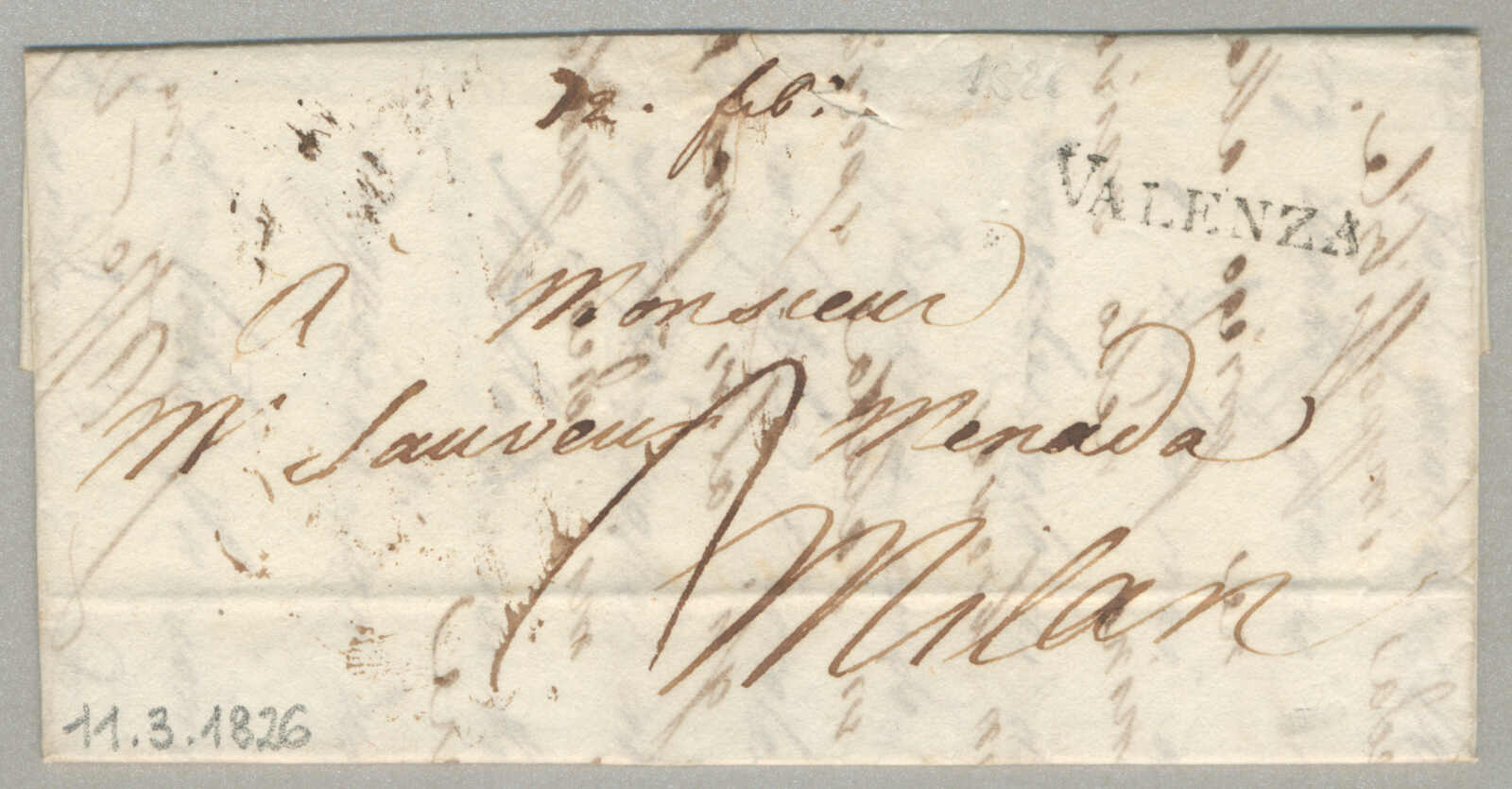 1826, with neatly strike of Valenza, on folded letter, ex Provera, XF! Estimate 140€. (Image) (imagea)
