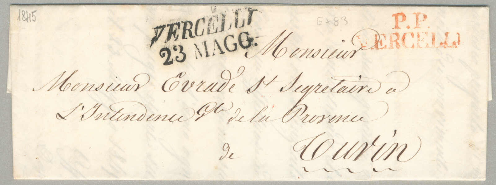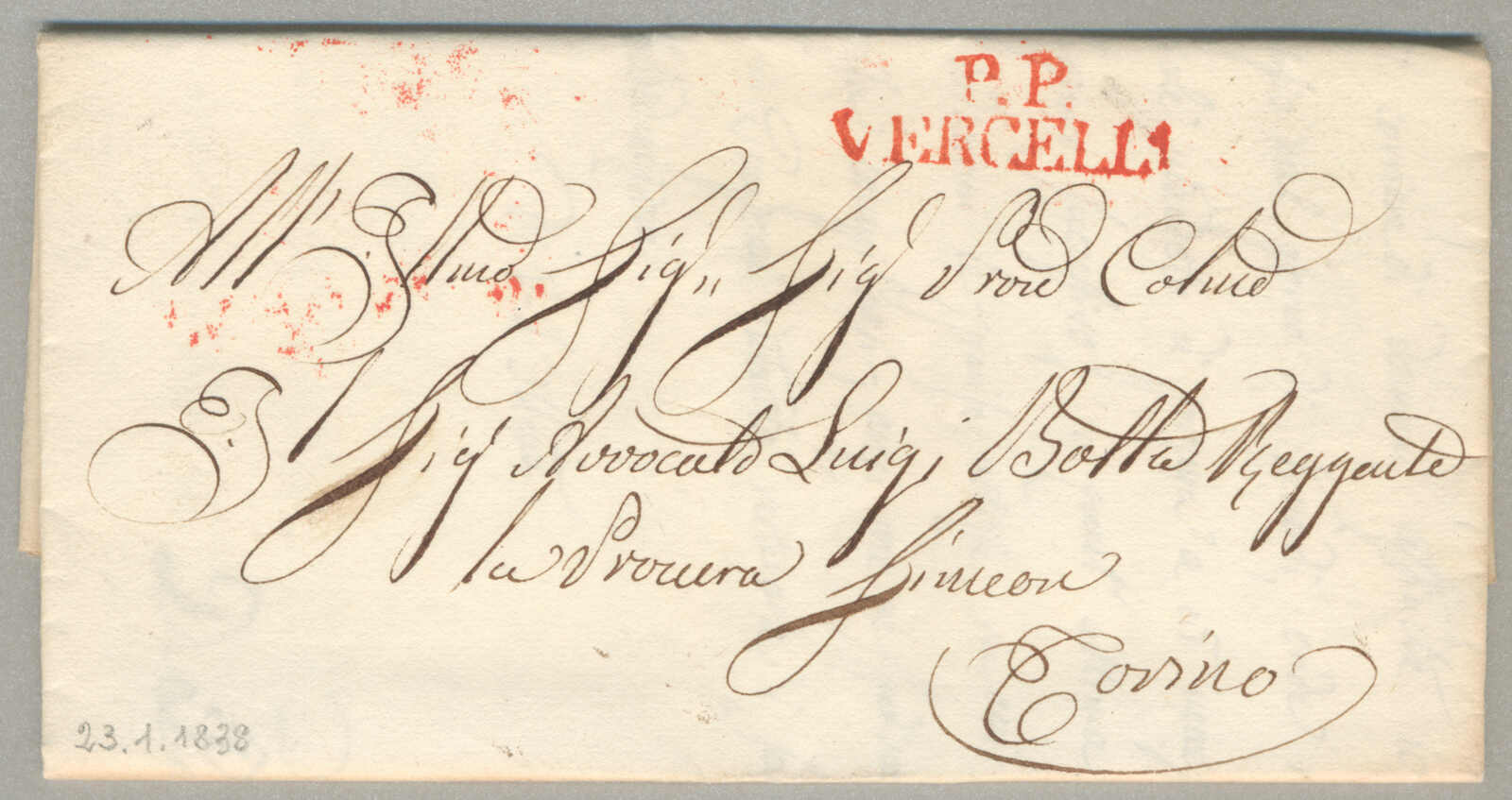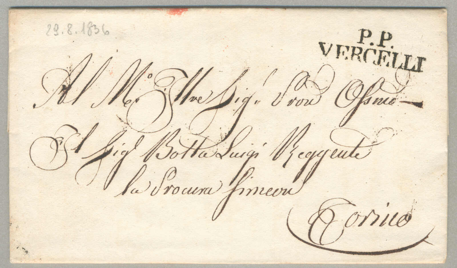 1832, with neatly strike of P.P. Vercelli, on folded letter, ex Provera, XF! Estimate 120€. (Image) (imagea)