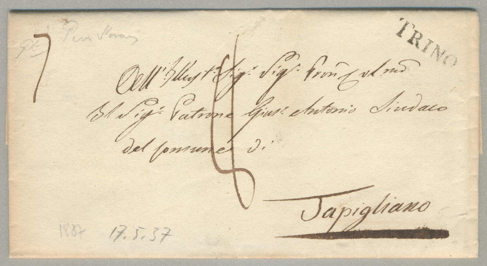 1837, with neatly strike of Trino, on folded letter, ex Provera, XF! Estimate 100€. (Image) (imagea)