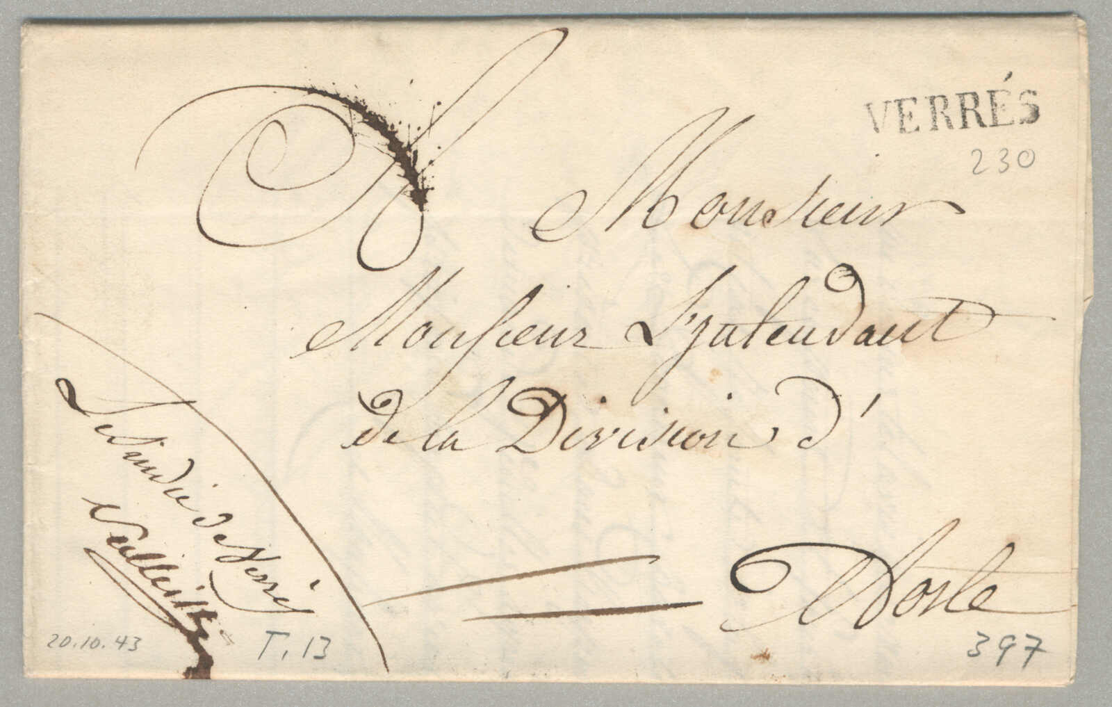 1843, with neatly strike of Verres, on folded letter, ex Provera, XF! Estimate 400€. (Image) (imagea)