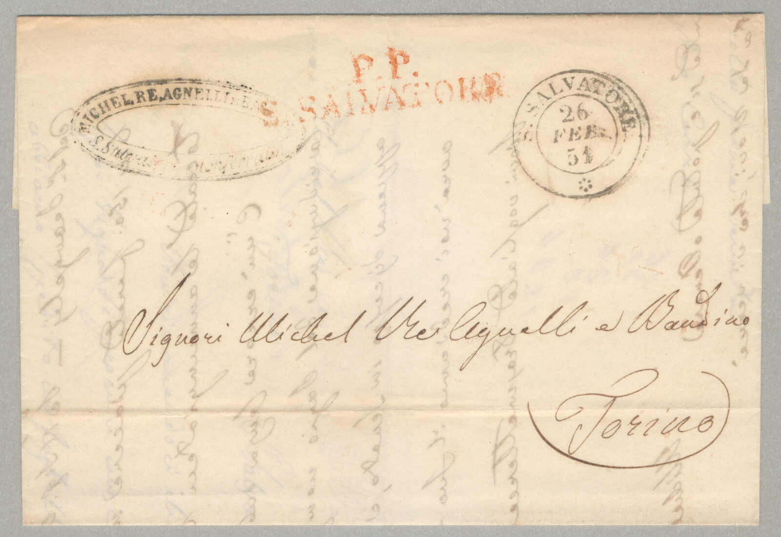 1851, with neatly strikes of S. Salvatore (Monferrato), on folded letter, ex Provera, XF! Estimate 100€. (Image) (imagea)