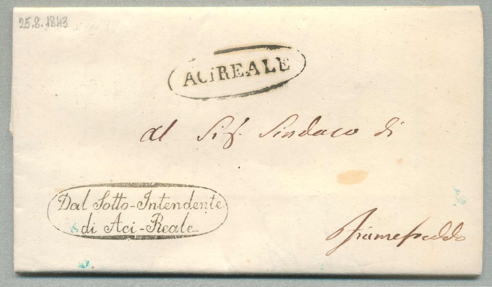 1843, with neatly strike of Acireale, on folded letter, ex Provera, XF! Estimate 300€. (Image) (imagea)