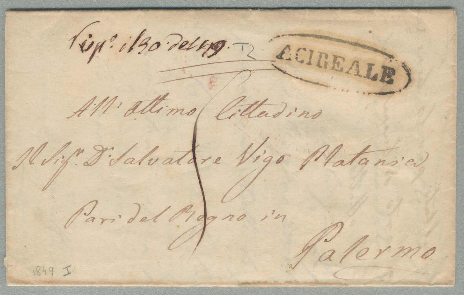 1849, with neatly strike of Acibeale, on folded letter, ex Provera, XF! Estimate 100€. (Image) (imagea)