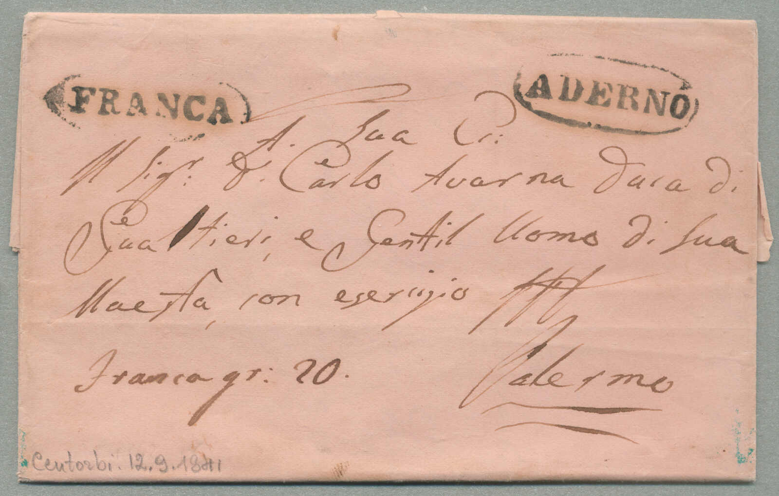 1841, with neatly strike of Aderno, on folded letter, ex Provera, XF! Estimate 80€. (Image) (imagea)