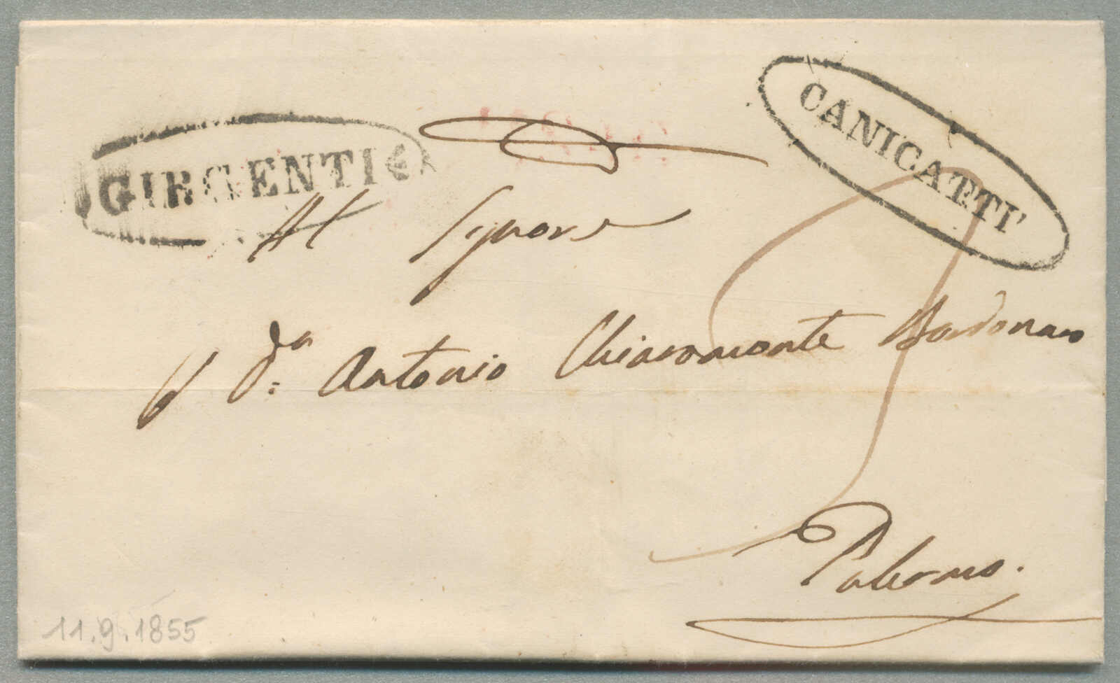 1855, with neatly strike of Canicatti and Girgenti, on folded letter, ex Provera, XF! Estimate 120€. (Image) (imagea)